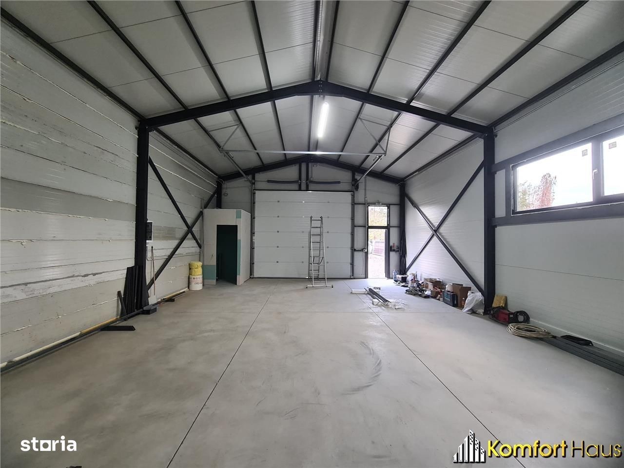 Compania Imobiliara KOMFORT HAUS va prezinta spre inchiriere, hala metalica industriala. Constructia este realizata din profile zincate, rezistente la coroziune si panouri sandwich. Hala ideala pentru productie, depozitare, show-room, prestari servicii, logistica, etc. Descriere: suprafata utila de 200 mp, inaltime 5 m la coama si 4 m la streasina, teren 600 mp, utilitati: curent trifazic, apa, canalizare. Pret : 900 euro + TVA. Pentru detalii nu ezitati sa ne contactati ! Tel.