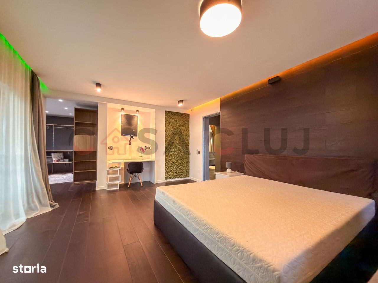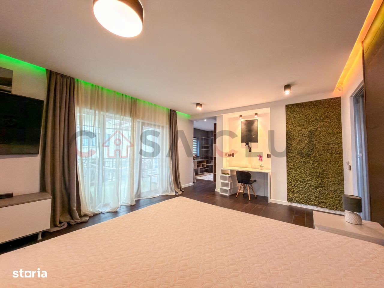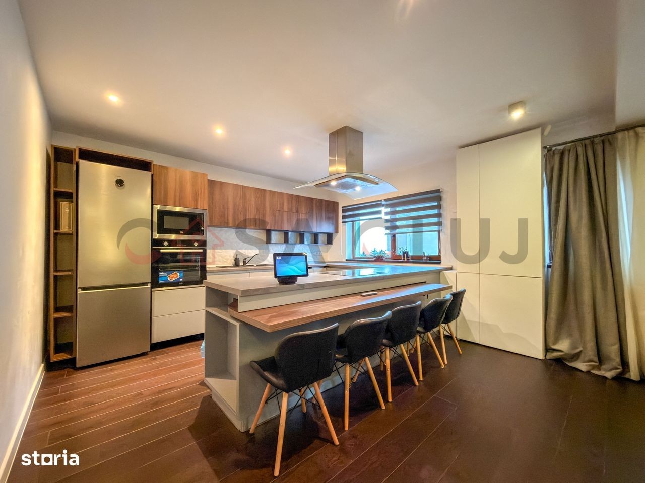 Un apartament spațios și elegant, situat în cartierul Europa, pe strada Eugen Ionesco, una dintre cele mai apreciate zone rezidențiale din Cluj-Napoca, la doar 3 km de centru. Zona oferă confort urban complet - stație de autobuz și easybox chiar în fața blocului, iar la doar 5 minute de mers pe jos se află Mega Image, Moldovan, farmacie și Profi. Detalii generale: Suprafață utilă: 106,32 mp Terase: 20 mp acoperită + 51 mp balcon semi-închis Orientare: sudică (terasă) și estică (dormitor secundar) Etaj: intermediar, într-un imobil cu doar 6 apartamente Se vinde complet mobilat și utilat, cu electrocasnice noi (2025) 2 locuri de parcare în garajul subteran: unul in proprietate + unul cu chirie redusă. Puncte forte: Finisaje premium: parchet triplu stratificat din stejar, lumini ambientale, bucătărie open-space complet echipată Living generos (40+ mp) cu zonă de bar ce poate fi transformată în dining și priveliște frumoasă asupra orașului Dormitor matrimonial (22 mp) cu dressing separat (9,2 mp), birou, aer condiționat smart și acces la terasa însorită Baie principală (6,65 mp) cu produse Grohe, Kludi, Geberit, încălzire în pardoseală, fereastră și walk-in shower Dormitor secundar (15,56 mp) orientat estic, perfect pentru copii sau oaspeți Sistem smart home: control Netatmo pentru încălzire, iluminat Philips Hue, senzori de securitate, folie privacy pe geamuri 2 parcări subterane mari, ambele cu prize 220V simple și industriale (pentru mașini electrice) o parcare este in proprietate (cu CF) care se vinde impreuna cu apartamentul la o diferenta de pret de 20 000Euro, iar una este închiriată cu 200 lei/luna. Spații exterioare și comunitate: Terasă acoperită de 20 mp, amenajată cu gazon artificial - ideală pentru relaxare, grădină urbană sau dining în aer liber Balcon semi-închis (5mp) accesibil din living Grădină comună privată pentru locatari, folosită ca zonă de relaxare și loc de joacă Comunitate restrânsă, liniștită și prietenoasă Localizare: Strada Eugen Ionesco, cartier Europa - zonă premium, liniștită, dar foarte bine conectată la centru și la principalele puncte de interes. Apartament complet mobilat și utilat, pregătit pentru mutare imediată. O proprietate rară, ideală pentru cei care caută confort, intimitate și calitate superioară în Cluj-Napoca.