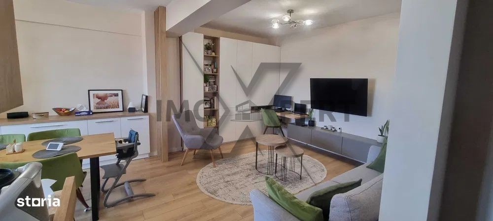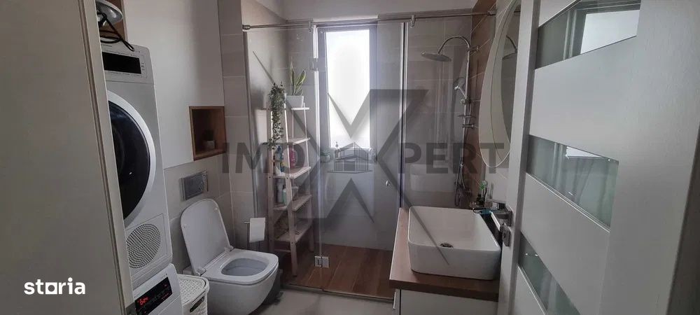 Apartament de 55 mp + terasă 15 mp, complet mobilat și utilat, locuit din 2021. Mobilier MDF, electrocasnice Bosch/Electrolux, încălzire în pardoseală, baie cu geam, instalație electrică refăcută, frigider 420L, mașină de spălat + uscător Bosch Serie 8. Compartimentare: living + bucătărie open space 32 mp (posibilitate de separare), dormitor 14 mp, baie 6 mp, hol 3 mp. Terasă panoramică pe toată lățimea apartamentului. Parcare subterană spațioasă - 20.000 EUR (opțional).