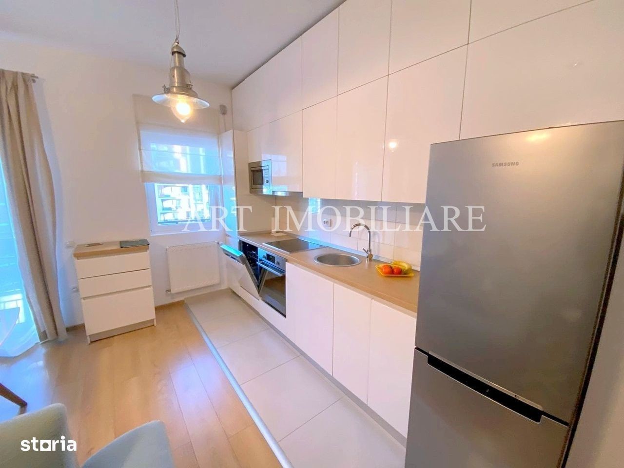 ART imobiliare va propune spre inchiriere un apartament cu 2 camere, suprafata de 55 mp, in bloc nou, mobilat modern, cu parcare subterana si cu terasa, situat in cartierul Buna Ziua, in complexul Bonjour Residence de langa magazinul LIDL si aproape de statia de autobuz. Apartamentul este situat la etajul 4 din 6 in bloc nou cu lift, are centrala termica proprie, este semidecomandat si este compartimentat astfel: dormitor cu pat dublu si cu dulap mare pentru haine, living open-space cu bucataria care este dotata cu cuptor electric si masina de spalat vase iar in living este un coltar extensibil si mobilier, hol, o baie cu cada, o terasa. In pretul chiriei este inclus un loc de parcare subteran.