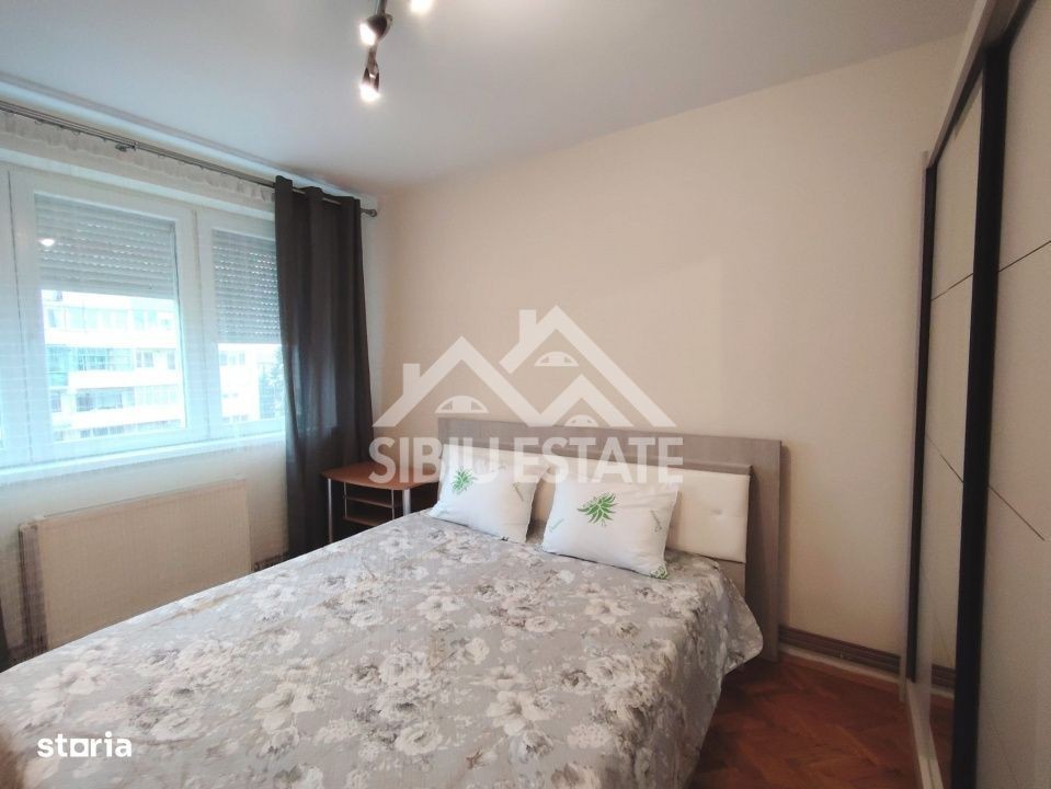 Apartament de inchiriat Sibiu, Mihai Viteazu - locatie excelenta -facilitati la indemana, magazine, scoli, parcul Subarini, 15 minute de centru oras, sali de sport, centre estetice, statie bus/taxi, Mall Locuinta spatioasa 76 mp, 3 camere si balcon inchis Apartamentul este renovat, situat la etaj 5, bloc cu lift, parcari libere Hol larg cu garderoba, zona de primire sau poti instala un birou Living generos deschis spre balcon. Balconul are termopane si calorifer, un spatiu mare - relaxare sau depozitare Bucataria este mobilata si utilata, semideschisa spre balcon 2 dormitoare confortabile - pat si saltele noi, 1 dulap nou Baie cu cada si fereastra Debara cu dulap depozitare si masina spalat rufe Conditii inchiriere - familie sau 2-3 persoane, cetateni romani, fara animale de companie 500 euro + garantie 500 euro, comision agentie 250 euro