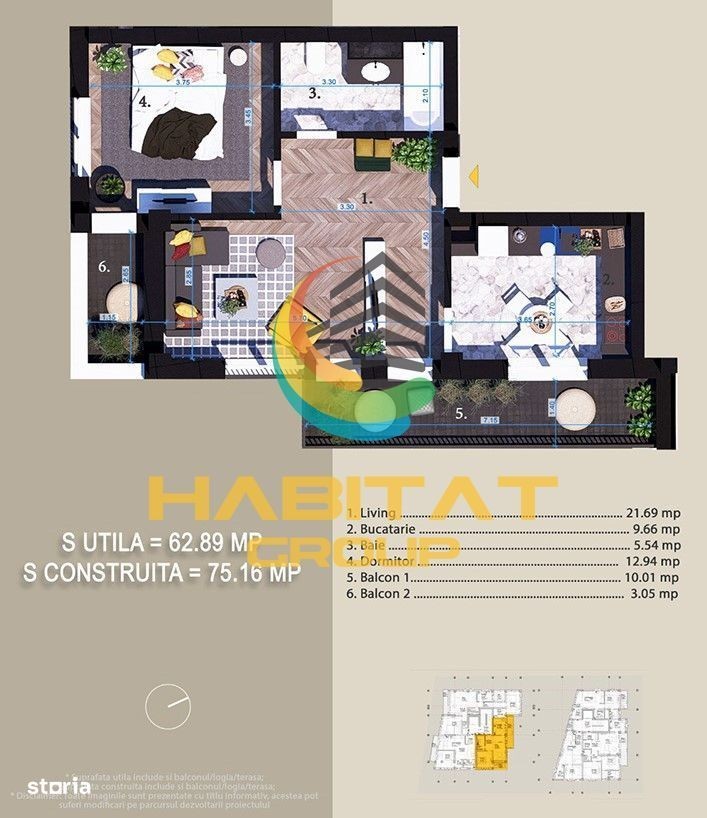Habitat Grup Imobiliare va ofera spre vanzare un apartament de 2 camere decomandat cu o suprafata utila totala de 62,89 mp la pretul promotional de 126.000 Euro TVA inclus pentru plata unui avans de 95% la antecontract. Apartamentul de 2 camere semidecomandat are suprafata utila de 49,83 mp plus balcoane cu suprafata de 13,06 mp, situat la etajul 1 al unui bloc cu 4 etaje si prevazut cu lift. Pe palier sunt prevazute doar 3 apartamente. In imediata vecinatate regasim Parcul Teilor si mijloace de transport in comun cum ar linia de autobuz 330 sau 253 la doar 5 minute mers pe jos. Apartamentele dispun de finisaje de calitate ( pe care le poti alege in functie de necesitate si de preferinte) inclusiv încălzire în pardoseală, was de toaleta încastrat și uși interioare de calitate superioară. Apartamentul se va preda la livrare echipat si utilat cu gresie, faianta, parchet, usi interior si cea de exterior securizata, geamuri termopan tip tripan, centrala proprie pe gaz in condensatie de 24 kw cu incalzire in pardoseala, baia echipata si utilata. Apartamentul va fi predat la cheie bransat la toate utilitatile Enel, Engie si Apanova. Fiecare detaliu este gândit pentru a-ți oferi confort maxim, cu soluții inteligente pentru depozitare și organizare eficientă a spațiului astfel incat sa-ti creezi un camin ideal. Situat într-o zonă liniștită, acest ansamblu rezidențial este aproape de facilități urbane, dar oferă liniștea de care ai nevoie. Nu rata ocazia de a locui într-un loc unic, perfect adaptat nevoilor tale. Separat se poate achizitiona loc parcare acoperit la pretul de 12.000 Eur TVA inclus sau loc parcare exterior neacoperit la pretul de 10.000 Eur TVA inclus Oferim asistenta gratuita in vederea intocmirii dosarului de creditare. Comision 0%. Pozele au titlul de prezentare. Oferta noastra completa o gasiti pe site-ul nostru habitatgroup.ro Locatie birou vanzari dezvoltator : strada Postasului nr.29, Sector 3 Waze: Habitat Group Estate Program vizionari: Luni - Vineri : 10:00 - 18:00 si Sambata : 10:00 - 14:00 Recomand vizionare Bogdan Mavrogheorghe telefon programari
