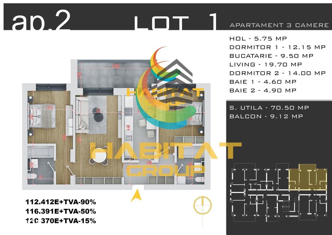 Locuința perfectă te așteaptă! Apartament modern cu 3 camere, decomandat, bucătărie inchisa, 2 băi și balcon generos de 9.12 mp. Situat la parterul inalt, acest apartament de 79.58 mp (70.46 mp utili) este alegerea ideală pentru confort și relaxare. Dotări premium incluse: Parchet laminat elegant Gresie și faianță de calitate Tâmplărie PVC cu geam termopan Ușă metalică securizată pentru siguranță Baie complet echipată Centrală proprie în condensație de 24 kW și încălzire în pardoseală - confort garantat Se predă „la cheie”, branșat la toate utilitățile (Enel, Engie și Apanova). Finalizare proiect: 2026 - Rezervă-ți acum noul tău cămin! Prețuri speciale: 112.412 euro + TVA - avans 90% la antecontract 116.391 euro + TVA - avans 50% la antecontract 120.370 euro + TVA - avans 15% la antecontract Pozele sunt cu titlu de prezentare. Locație: Strada Poștașului nr. 29, Sector 3 Waze: Habitat Group Estate Program vizionări: Luni - Vineri: 10:00 - 18:00 Sâmbătă: 10:00 - 14:00 Contact: Daniel Manea -