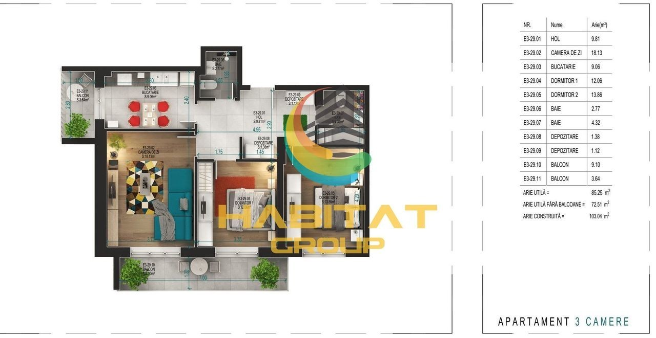 Habitat Grup Imobiliare va ofera spre vanzare un apartament de 3 camere decomandat cu o suprafata utila totala de 85,25 mp la pretul promotional de 125.235 Euro TVA inclus pentru plata unui avans de 90% la antecontract + LOC PARCARE GRATUIT sau 130.452 Euro TVA inclus pentru plata unui avans de 50% la antecontract sau 135.670 Eur TVA inclus pentru plata unui avans de 15% la antecontract. Apartamentul de 3 camere decomandat are suprafata utila de 72,51 mp plus 2 balcoane cu suprafata totala de 12,74 mp, situat la etajul 3 al unui bloc cu 3 etaje si prevazut cu lift. Pe palier sunt prevazute doar 9 apartamente. In imediata vecinatate regasim magazine, scoli, gradinite, spital, precum si mijloace de transport in comun. Apartamentele dispun de finisaje de calitate ( pe care le poti alege in functie de necesitate si de preferinte) inclusiv încălzire în pardoseală, wc încastrat și uși interioare de calitate superioară. Apartamentul se va preda la livrare echipat si utilat cu gresie, faianta, parchet, usi interior si cea de exterior securizata, geamuri termopan, centrala proprie in condensatie de 24 kw cu incalzire in pardoseala, baile echipate si utilate. Apartamentul va fi predat la cheie bransat la toate utilitatile Enel, Engie si Apanova. Fiecare detaliu este gândit pentru a-ți oferi confort maxim, cu soluții inteligente pentru depozitare și organizare eficientă a spațiului astfel incat sa-ti creezi un camin ideal. Situat într-o zonă liniștită, acest ansamblu rezidențial este aproape de facilități urbane, dar oferă liniștea de care ai nevoie. Nu rata ocazia de a locui într-un loc unic, perfect adaptat nevoilor tale. Separat se poate achizitiona loc parcare subteran la pretul de 6.500 Eur fara TVA sau loc parcare suprateran la pretul de 5.500 Eur fara TVA. Oferim asistenta gratuita in vederea intocmirii dosarului de creditare. Comision 0%. Pozele au titlul de prezentare. Oferta noastra completa o gasiti pe site-ul nostru habitatgroup.ro Locatie birou vanzari dezvoltator : strada Postasului nr.29, Sector 3 Waze: Habitat Group Estate Program vizionari: Luni - Vineri : 10:00 - 18:00 si Sambata : 10:00 - 14:00 Recomand vizionare Bogdan Mavrogheorghe telefon programari