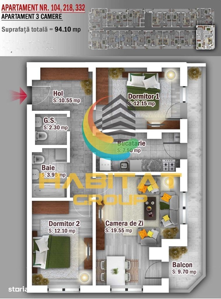 Habitat Group Estate va prezinta un apartament de 3 camere semi-decomandat avand o suprafata totala utila de 71,6 mp la pretul promotional de 151.734 Eur TVA inclus. Apartamentul este finalizat cu ACTE GATA DE MUTARE si se afla la o distanta de doar 5 minute metrou A.Saligny. Apartamentul de 3 camere semi-decomandat este situat la etajul 4 al unui bloc P+4E+5R+6R+7R niveluri, cu o compartimentare ideala pentru familia dumneavoastra si anume suprafata utila de 56,45 mp + terasa de 15,15 mp. Apartamentul se preda echipat si utilat cu gresie, faianta, parchet, usi interior si cea de exterior securizata, centrala proprie in condensatie de 24 kw, baile echipate si utilate. Apartamentul v-a fi predat la cheie bransat la toate utilitatile Enel, Engie si Apanova. Amplasat la doar 5 minute de statia de metrou Anghel Saligny, in apropriere de supermarket Auchan, IKEA, JUMBO, gradinite, scoli, farmacii, spitale, spatii verzi si de agrement, confera confortul mult dorit pentru familia dumneavoastra. Oferim asistenta in vederea intocmirii dosarului de creditare. Comision 0%. Optional se poate achizitiona separat si loc de parcare acoperit la pretul de 12.000 Eur fara TVA sau loc parcare suprateran neacoperit la pretul de 10.000 Eur fara TVA. Poze reale din acest ansamblu rezidential. Locatie birou vanzari dezvoltator : strada Postasului nr.29, Sector 3 Waze: Habitat Group Estate Program vizionari: Luni - Vineri : 10:00 - 18:00 si Sambata : 10:00 - 14:00 Recomand vizionare Bogdan Mavrogheorghe