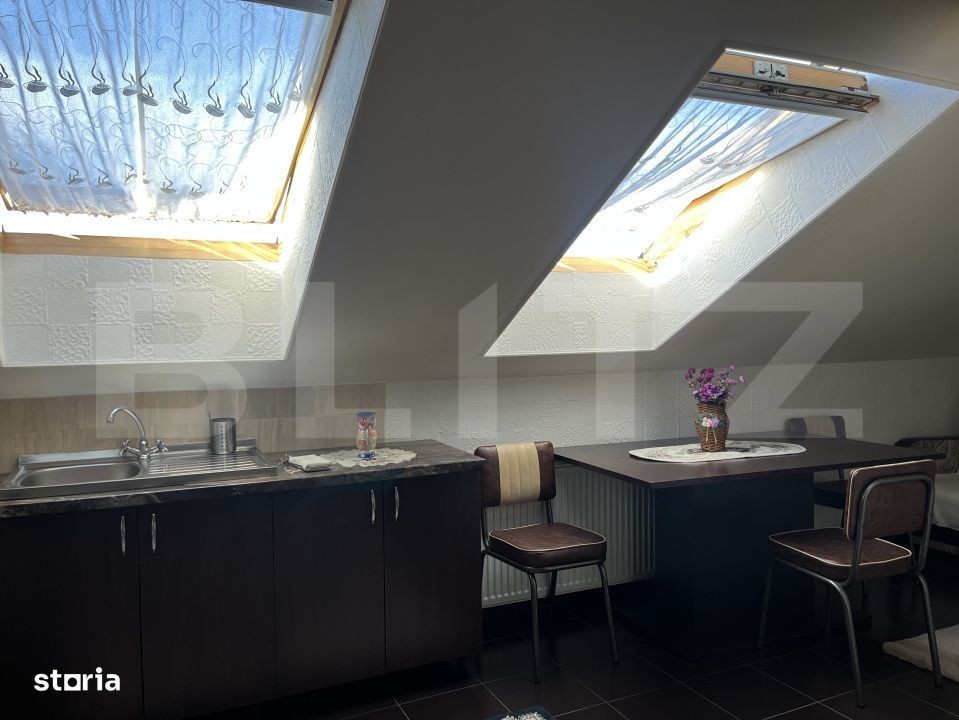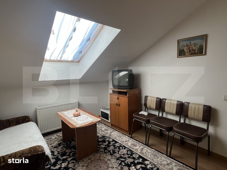 Blitz oferă spre închiriere un apartament cu 2 camere, situat în Florești, zona Florilor. Acesta se află la mansardă și reprezintă o alegere ideală pentru un cuplu. Apartamentul are o suprafață utilă de 47 mp, este complet mobilat și gata de utilizare. Compartimentarea este eficientă, fiind alcătuit dintr-un dormitor, un living separat, o bucătărie și o baie. Proprietatea dispune de finisaje moderne, centrală termică, mașină de spălat rufe și alte dotări utile. In proximitatea zonei exista acces pentru supermarket, magazine, fast food-uri, mijloace de transport in comun, etc. Disponibil imediat!