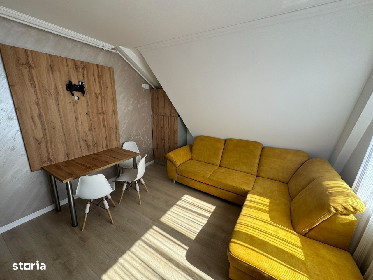 De inchiriat apartament nou situat in Complex Odobescu la etajul 3/mansarda compus din living cu bucatarie open space, dormitor, baie, hol, balcon si parcare privata. Dispune de geamuri termopane, aer conditionat, incalzire cu microcentrala pe gaz, finisaje noi moderne, izolatie exterioara, usa metalica si se preda complet mobilat-utilat.