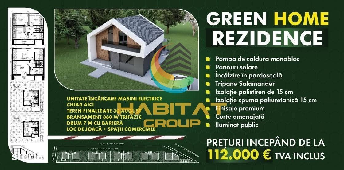 Descoperă viitorul locuințelor moderne și sustenabile! Un cămin pregătit pentru tine și familia ta, într-un complex privat cu acces securizat, iluminat public, drum privat de 7 m și supraveghere video - totul gândit pentru confort și liniște. Dotări premium & eficiență energetică: • Pompă de căldură monobloc Ariston • Încălzire în pardoseală • Panouri solare 10 kW - costuri reduse la energie • Branșament trifazic 360V • Stație de încărcare pentru mașini electrice în complex • Izolație superioară: 15 cm spumă poliuretanică + 15 cm polistiren grafitat • Tâmplărie Salamander Blue Evolution cu geam tripan • Finisaje premium și curte amenajată Locație excelentă & facilități complete: • Drum privat cu barieră de acces • Loc de joacă pentru copii • Spații comerciale în apropiere • Infrastructură completă, gândită pentru un stil de viață modern Design modern & flexibilitate: • Compartimentare inteligentă • Mansardă open-space, perfectă pentru birou, hobby room, dressing sau un al doilea living - o poți transforma exact cum îți dorești. Prețuri intre 112.000 € și 137.000 € (TVA inclus), în funcție de nivelul de amenajare. Pentru detalii sau programarea unei vizionari ma puteti contacta la