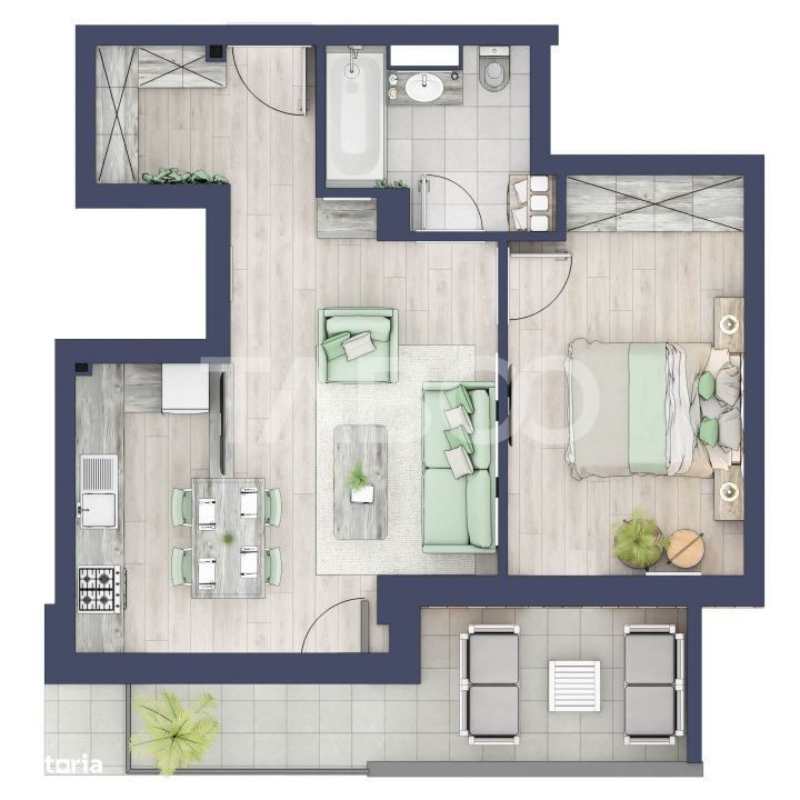 Comision 0 apartament 2 camere de vanzare, semidecomandat, 47 mp utili, zona Turnisor, Sibiu. Cauti un apartament la parter sau parter inalt! Programeaza o vizionare pentru acest apartament pozitionat la parterul inalt cat un etaj 1, si convinge-te ca este ceea ce iti doresti. In plus, ansamblul este amenajat intr-o zona retrasa, de case, avand diverse amplasamente pentru agrement precum zona de gratar, zona de fitness si parc de joaca pentru copii. • Locatie ferita de aglomeratie; • Boxa la subsol inscrisa in acte; • Parcare extra pentru vizitatori; • Zone de agrement. TABOO Imobiliare propune un apartament de vanzare cu 2 camere, semidecomandat, situat in localitatea Sibiu, zona Turnisor, aflat la etajul parterul unui imobil tip bloc cu regim de inaltime pe Parter + 3 Etaje + Etaj Retras; anul constructiei 2025, structura caramida. Suprafata utila de 47 mp + balcon de 10 mp. • Hol; • Bucatarie cu living; • Baie; • Dormitor; • Balcon. • Usa intrare: metal; • Usi interioare: celulare; • Tamplarie ferestre: pvc, termopan; • Pereti: var, faianta; • Podele: parchet, gresie. • Bucatarie: nemobilata, neutilata; • Mobilat: nemobilat; • Utilitati: curent electric, apa, canalizare, gaz, catv, fibra optica; • Izolatii: exterior, bloc izolat termic; • Contorizare: apometre, contor caldura, contor gaz, contorizare separata; • Caracteristici bloc: videointerfon, lift, acoperis. Apartamentul se vinde nemobilat si neutilat. Pretul de vanzare afisat nu contine TVA si se poate achizitiona prin urmatoarele variante: • cu TVA 9% cu predare "la cheie", echipat cu peret finisati cu vopsea lavabila alba, faianta, gresie, parchet, usi inetrioare, vas toaleta, lavoar cu chiuveta si baterie. Bugetul pentru finisaje incluse este de 8.580€ + TVA; • cu TVA 19% cu predare "la alb". Incalzirea se realizeaza prin centrala proprie si incalzire in pardoseala. Apartamentul nu detine loc de parcare inclus, acesta putand fi achizitionat extra. Imaginile sunt cu titlu informativ, iar ca si modalitate de plata surse proprii sau credit bancar. Pret: 122.089€ Sună-ne acum și află detalii despre această proprietate de vanzare din Sibiu, dar și despre alte proprietăți potrivite pentru tine.