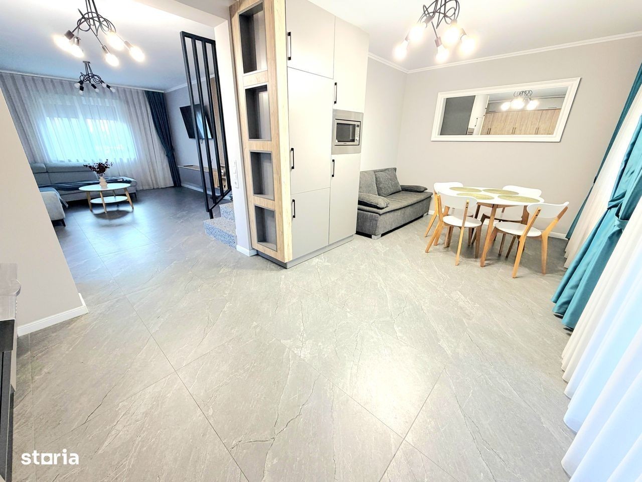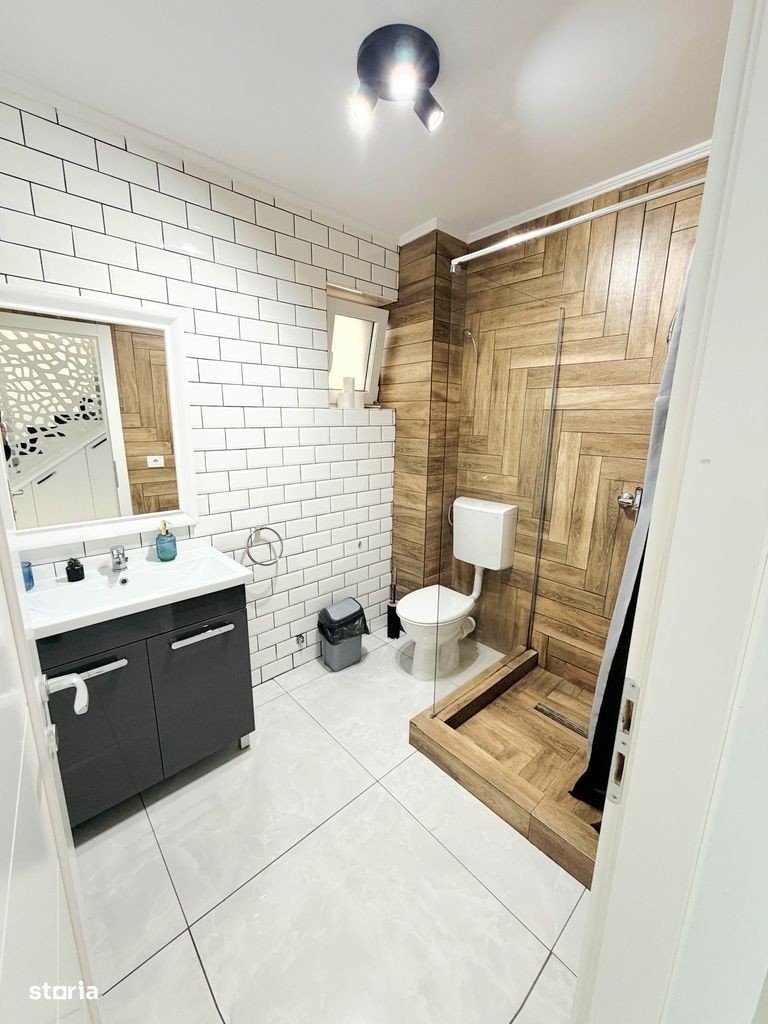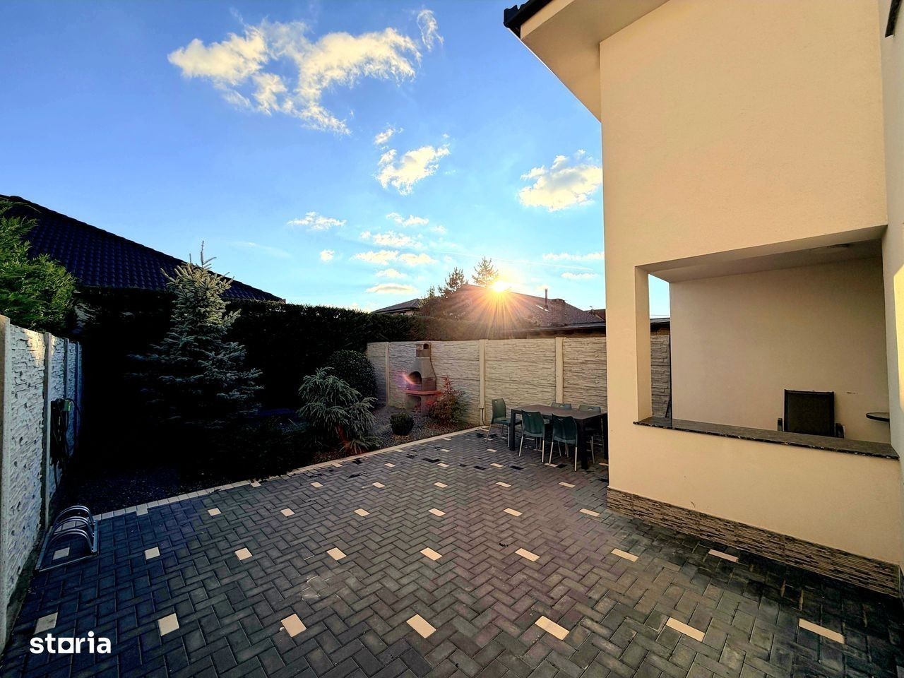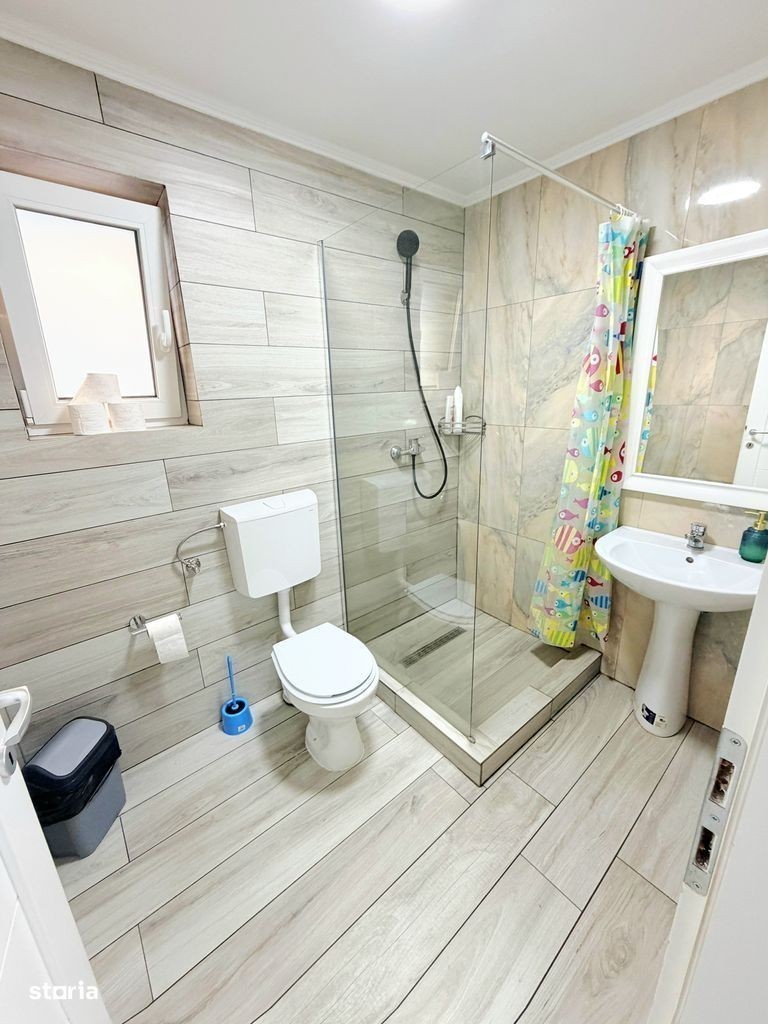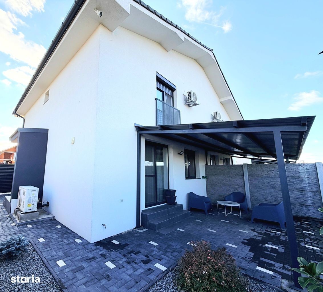 Va propunem la închiriere o casa modernă,compusă din:parter cu living room,bucătărie separată, 1 baie,ieșire pe terasă;etaj cu 3 dormitoare și 1 baie.Casa se închiriază mobilată și utilată în totalitate:Tv (in toate camerele),plită,cuptor electric,hotă,frigider,mașină de spălat vase,masină de spălat și uscat haine,aer condiționat.Casa este situată în cartier rezidențial Nicolae Grigorescu,la 3 min de Profi Market,LIDL,10 min de centrul orașului,iesire la centura.Confortul termic se face cu centrală proprie pe gaz,casa având costuri reduse de întreț fața casei sunt disponibile și 2 locuri auto.Preț 1200 euro.