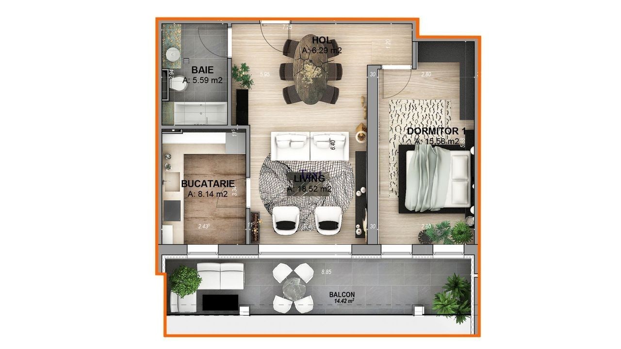 Apartament 2 camere, finisat la cheie, aer conditionat inclus Apartamentul este format dintr-un hol de acces, un living cu bucatarie open space, un dormitor, o baie, si un balcon de 18 mp. Accesul pe balcon se face din living si din dormitor. Avantaje: - Etaj intermediar, 1/2 - Incalzire in pardoseala - Balcon cu orientare sudica - Aer conditionat - Loc de parcare inclus - Priveliste - Predare finisat la cheie, cu materiale la alegere - Spatii de depozitare - Izolatie cu vata bazaltica - Balconul si casa scarii se predau finisate la cheie, cu granit si sticla securizata. Loc de parcare: In pretul acestui apartament de vanzare este inclus un loc de parcare suprateran. Locatie: Ansamblul rezidential este amplasat in zona de vest, loc. Cristian. Distanta de 4 minute pana la Zona Industriala Vest, 4 minute pana la Metro si 15 minute pana in centrul istoric al Sibiului. Predare: Acest imobil se preda finisat la cheie in primavara anului 2026. Se poate preda atat la alb, cat si complet mobilat+utilat. Modalitati de plata: Surse proprii sau credit bancar. * Fotografiile afisate sunt folosite cu scop informativ. * Pretul include TVA.