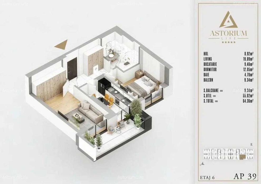 Vezi mai multe unitati disponibile direct pe site astorium.ro Apartamentul are o suprafata de 64.36 mp utili si este dotat cu finisaje premium, pretul nu include TVA: - Încălzire în pardoseală - Geam Tripan - Izolație fonica in apartament cu vata bazaltica - Compartimentare cu zidărie - Izolație exterioara vata minerala 15 cm - Băi complet echipate cu obiecte sanitare GEBERIT Cel mai recent proiect al nostru, Astorium Life, este și cel mai impunător de până acum. Complexul upper premium, cu 700 de apartamente, va fi construit în sectorul 3, în zona Bulevardului Theodor Pallady Am gândit proiectul special pentru cei care caută o locuință elegantă și modernă, cu spații verzi extinse și diverse facilități de petrecere a timpului liber. Noul complex va avea o arhitectură rafinată, iar apartamentele vor fi spațioase și compartimentate inteligent, cu finisaje de calitate superioară, pe care ți le vei putea alege chiar tu. În plus, pentru confortul tău, îți punem la dispoziție încălzire în pardoseală și infrastructură pentru smart home gata instalată. Vizionarile si achizitia se fac direct la dezvoltator: 07******05
