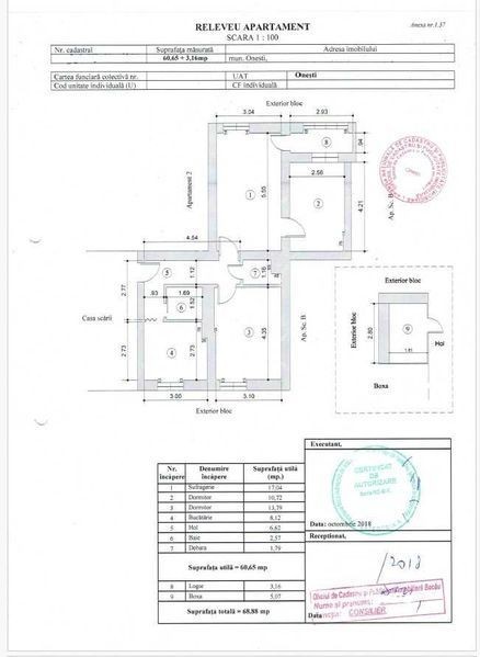 Apartament cu 3 camere amplasat în zona linistita-Cvartal,cu balcon si cu boxa la subsol.Tîmplarie exterioara din aluminiu+geam termopan,usi interioare din lemn,usa metalica de acces,încalzire cu calorifere metalice+CT gaz metan,aparate de aer conditionat în fiecare camera,pardoseli din parchet si gresie,faianta la baie si bucatarie, tavan fals din Rigips la holuri,baie si bucatarie.Renovat integral în 2001,reparatie majora la acoperis în 2019 (înlocuit elemente de lemn deteriorate,înlocuit tigle crapate si montat folie impemreabila sub tigle).In incinta aferenta imobilului este loc de parcare concesionat de la Primarie.