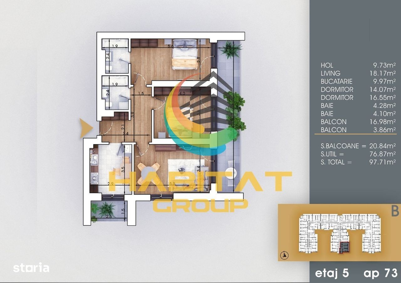 Habitat Grup Imobiliare va prezinta un ansamblu rezidential nou, situat in zona Theodor Pallady-Titan, cu regim de inaltime Demisol + Parter +12 Etaje situat la doar 5 minute mers pe jos pana la statia de metrou Nicolae Teclu. Apartamentul de 3 (trei) camere decomandat este situat la etajul 5 din 12 si are o suprafata utila totala de 97,71 mp din care 76.87 mp suprafata apartamentului + 20,87 mp de terasa generoasa la pretul PROMO de 150.040 Euro TVA inclus pentru un avans de 90% la antecontract sau 159.720 Eur TVA inclus pentru avans de 15% la antecontract. Locuinta se vinde complet finisata si dotata cu centrala termica pe gaz in condensatie proprie, incalzire in pardoseala, obiecte sanitare PREMIUM pentru baie, tamplarie PVC cu geam termopan SALAMANDER, granit pe holurile interioare ale blocului si in balcoanele apartamentelor, usa metalica, instalatii sanitare si electrice. Blocul este unul modern cu holuri spatioase si prevazut cu 4 lifturi hidraulice de ultima generatie ce faciliteaza accesul catre etajele superioare, structura de beton si compartimentare din caramida tip BCA. Toate apartamentele se bucură de următoarele dotări: * Compartimentarea se face cu caramida BCA tip YTONG; * Încălzire in pardoseala si centrală termică individuala in condensatie de 24kW (pe Gaz); * Vas de toaleta incastrat firma Cersanit; * Chiuvetă suspendată; * Cabluri TV și internet încorporate (în toate camerele); * Ușa intrare metalică; * Tâmplărie termopan cu geamuri mari ce oferă zone vitrate mari (de sus până jos); * Băile sunt dotate cu cadă sau dus. Zona este una rezidentiala, cu strazi asfaltate, trotuare si iluminat public, aflata in apropiere, la doar cateva minute, de centrele comerciale (IKEA, Auchan, Lidl, Metro, Decathlon, JYSK, Mega Image, Dedeman, Leroy Merlin, etc.), de noul bazin de inot, sala de sport dar si de unitati de invatamant (scoli si gradinite). Bransarea se realizeaza la toate utilitatile sectorului 3: canalizare, gaze naturale, curent electric, apa. Separat se poate achizitiona loc de parcare suprateran la pretul de 8.000 Eur fara TVA sau loc parcare semiacoperit la pretul de 10.000 Eur fara TVA sau loc parcare acoperit la demisol la pretul de 12.000 Eur fara TVA. Oferim asistenta gratuita in vederea intocmirii dosarului de creditare. Comision 0%. Poze cu titlu de prezentare din acest ansamblu rezidential. Locatie birou vanzari dezvoltator : strada Postasului nr.29, Sector 3 Waze: Habitat Group Estate Program vizionari: Luni - Vineri : 10:00 - 18:00 si Sambata : 10:00 - 14:00 Oferta completa o gasiti pe site-ul nostru : Recomand vizionarea Bogdan Mavrogheorghe
