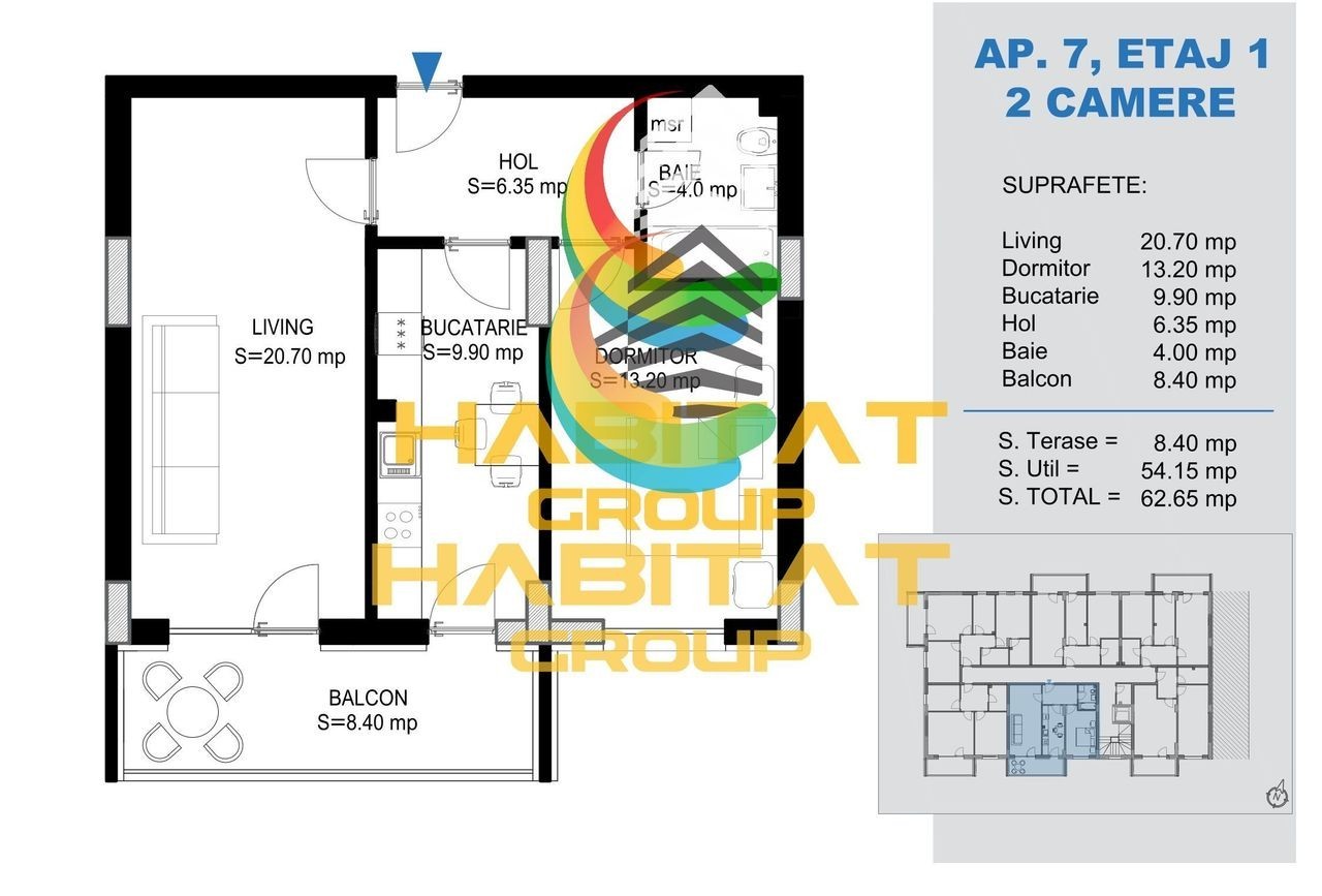 Apartament modern cu 2 camere, decomandat, 1 baie și balcon generos de 8.4 mp. Situat la etajul 1 din 4, acest apartament de 62.65 mp (54.15 mp utili) este alegerea ideală pentru confort și relaxare. Dotări premium incluse: Parchet laminat elegant Gresie și faianță de calitate Tâmplărie PVC cu geam tripan Ușă metalică securizată pentru siguranță Baie complet echipată Centrală proprie în condensație de 24 kW și încălzire în pardoseală - confort garantat Se predă „la cheie”, branșat la toate utilitățile (Enel, Engie și Apanova). Finalizare proiect: 2026 - Rezervă-ți acum noul tău cămin! Prețuri: 93.225 euro + TVA - avans 90% la antecontract 96.333 euro + TVA - avans 50% la antecontract 99.440 euro + TVA - avans 15% la antecontract Pozele sunt cu titlu de prezentare. Locație: Strada Poștașului nr. 29, Sector 3 Waze: Habitat Group Estate Program vizionări: Luni - Vineri: 10:00 - 18:00 Sâmbătă: 10:00 - 14:00 Contact: Daniel Manea -