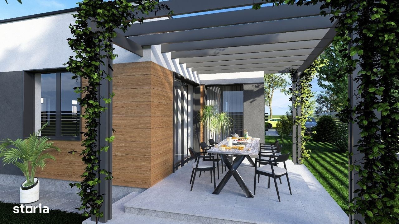 Descoperă un proiect rezidențial premium în dezvoltare: ansamblu modern format din 6 case identice, tip parter, amplasate într-o zonă liniștită, aproape de oraș și la doar 200 m de pădure. Locuințe ideale pentru familii care apreciază confortul, spațiul, eficiența energetică și liniștea naturii. Caracteristici generale Suprafață utilă: 142 mp (124 mp fără terase) Teren: 500 mp + drum de acces privat Compartimentare: living, bucătărie, 3 dormitoare, 2 băi, dressing, cameră tehnică, terase