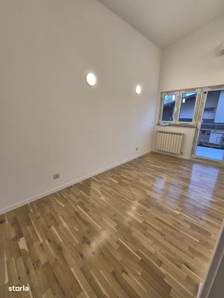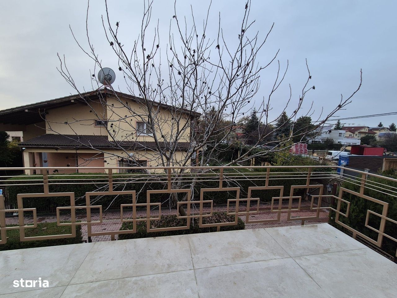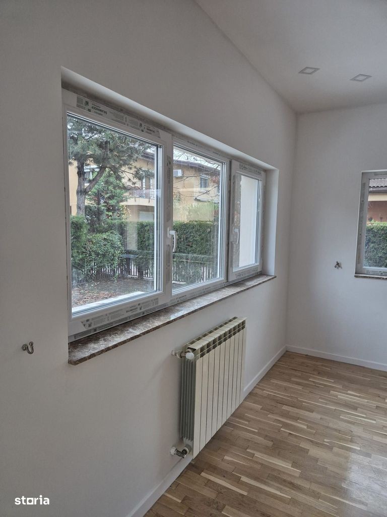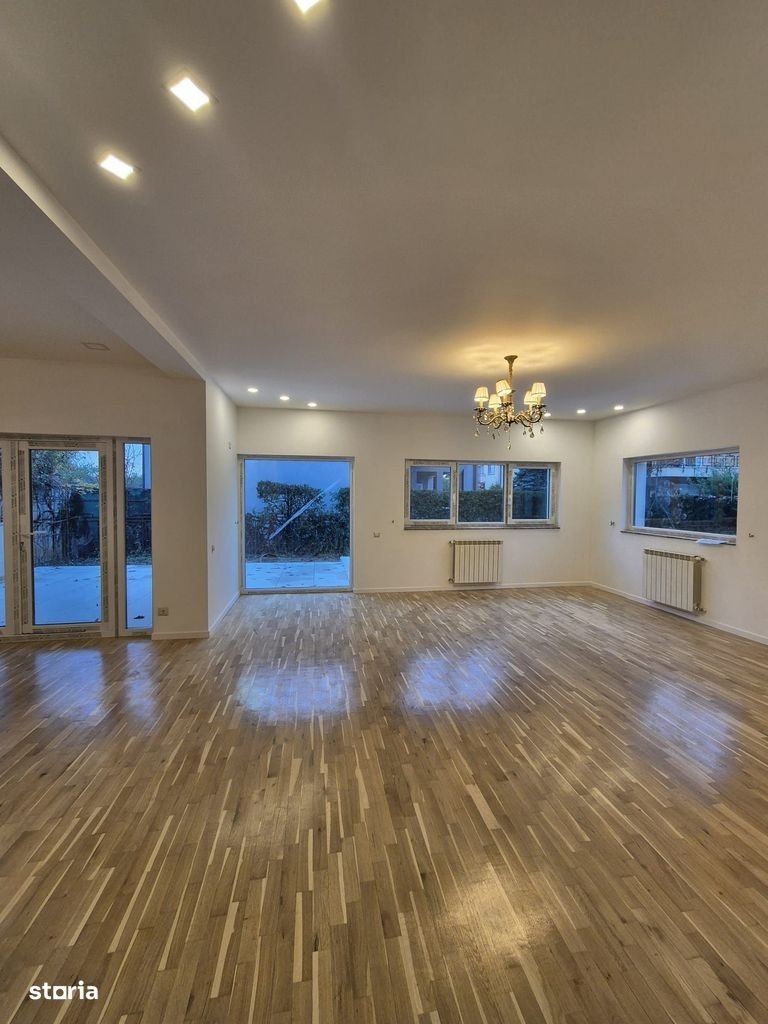 Vila renovata - PRIMA INCHIRIERE! Localizata in Pipera - Drumul Negru - complex privat. P+1E Va propunem spre inchiriere o vila deosebita, renovata in 2025, aflata la prima inchirere dupa renovare, cu finisaje de calitate superioara, tamplarie noua tripan, usi noi, curte privata (380mp), garaj pentru o masina cu acces direct in casa plus inca un loc de parcare in curte. Baile si bucataria sunt mobilate utilate. Tamplaria este de calitate inalta, Salamander, casa este izolata termic cu polistiren la exterior si construita din caramida poroterm pe structura din stalpi de beton, acoperita cu tigla metalica. La pardoseala s-a folosit parchet din lemn masiv, gresie si piatra naturala. Dispunerea este urmatoarea: Parter: living, dinning, bucatarie - mobilata si utilata, camera tehnica, camera pentru birou, terasa, grup sanitar si garaj. Etaj: 3 dormitoare si o camera spatioasa 2 terase si un balcon. Dormitorul matrimonial are dresing si baie proprie + balcon, celelalte 2 fiind deservite de o baie cu acces din hol. Terasele sunt placate cu travertin pe sistem flotant, permitand atat scurgerea apei cat si aerisirea terasei.