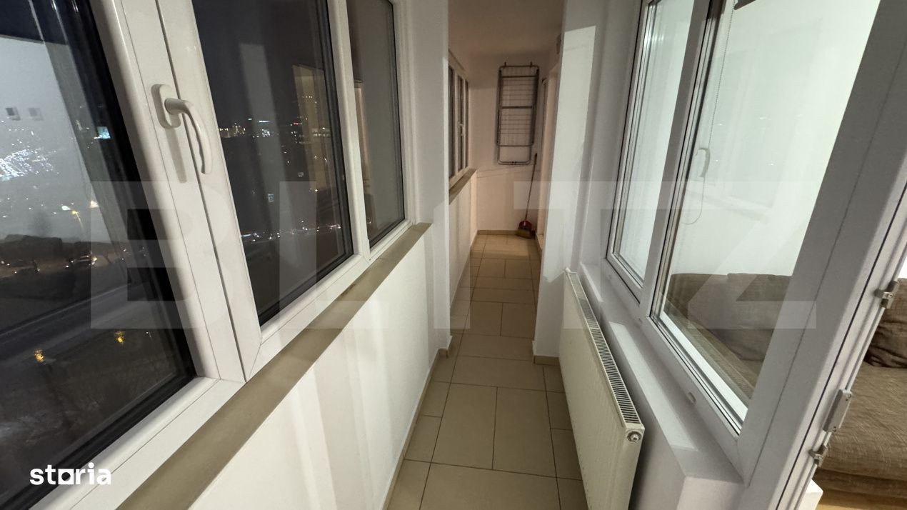 Blitz va propune spre vânzare un apartament de 4 camere situat într-una dintre cele mai căutate zone ale orașului - Podu Roș - o locuință spațioasă, bine compartimentată și cu o priveliște spectaculoasă asupra Bahluiului și a întregii zone centrale. Situat la etajul 10 al unui bloc cu poziționare excelentă, apartamentul oferă o suprafață utilă de 84 mp, la care se adaugă un balcon generos de 7 mp, cu acces atât din living, cât și din unul dintre dormitoare. Panorama este cu adevărat impresionantă, atât ziua cât și noaptea: sensul giratoriu Podu Roș, râul Bahlui și o vedere deschisă asupra orașului. Locuința este decomandată și foarte bine structurată: la intrare te întâmpină un hol larg, care oferă acces către prima baie, bucătărie și către prima cameră - potrivită ca birou sau dormitor secundar. Din aceeași zonă se intră în livingul spațios, zona centrală a apartamentului, care face trecerea către un al doilea hol ce deschide drumul către două dormitoare bine proporționate și către a doua baie. Apartamentul se remarcă printr-un nivel de confort superior, fiind dotat cu încălzire în pardoseală pe toată suprafața, iar în dormitorul matrimonial este disponibilă și încălzire prin pereți, pentru un climat interior optim în orice anotimp. Holurile generoase și compartimentarea inteligentă amplifică senzația de spațiu și oferă multiple opțiuni de organizare. Balconul reprezintă un avantaj major - spațios, cu o deschidere amplă spre oraș, perfect pentru momente de relaxare sau pentru a admira luminile orașului după lăsarea serii. Localizarea centrală conferă acces rapid către transport, facultăți, magazine, zone verzi și puncte de interes importante din oraș. Un apartament complet, luminos, cu o priveliște rară și cu o compartimentare ideală atât pentru familie, cât și pentru cei care doresc spațiu, confort și acces facil în zona centrală. Vă așteptăm cu drag la vizionare!