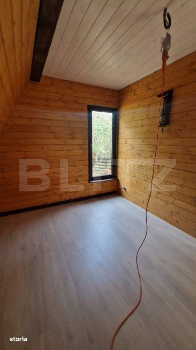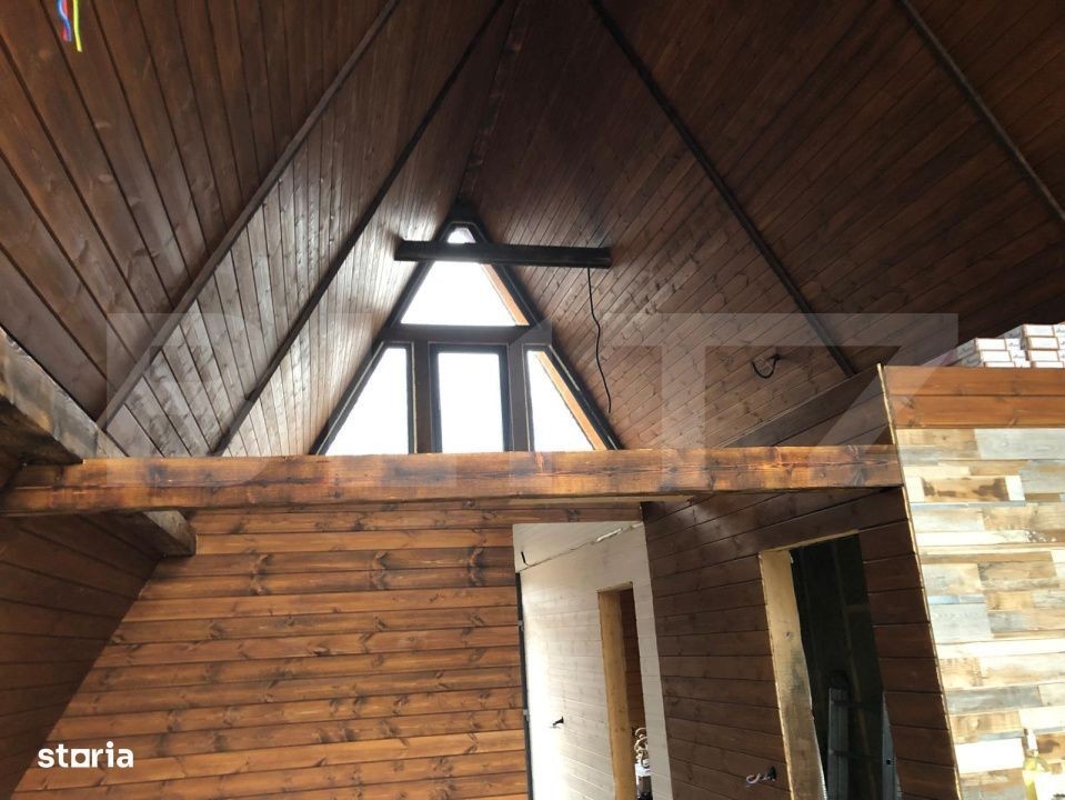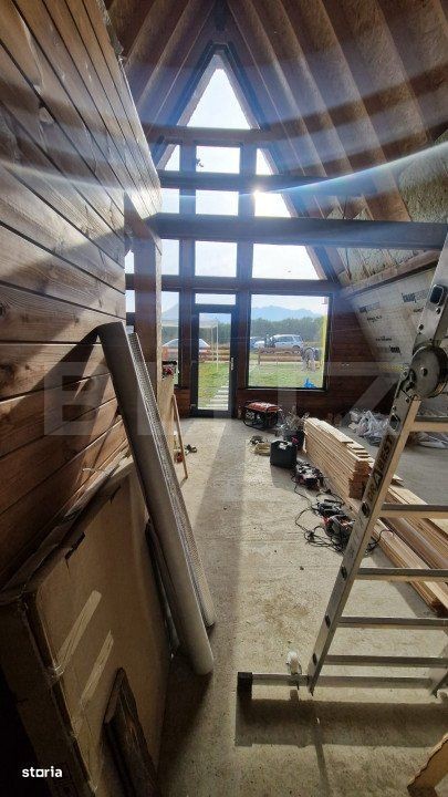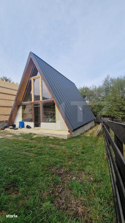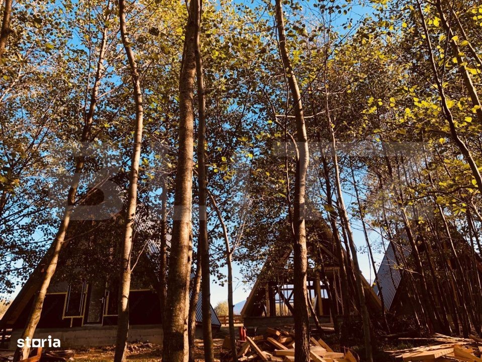 Acest pachet exclusiv de 3 case tip A-frame este amplasat într-o zonă de vis, cu panoramă deosebită către munți și beneficiază de soare pe tot parcursul zilei. Fiecare casă poate fi achiziționată individual sau ca parte a pachetului de 3 unități, ceea ce reprezintă o oportunitate excelentă de investiție, deoarece se pot închiria pe tot parcursul anului. Situate departe de agitația urbană, aceste locuințe oferă liniște și intimitate, având acces la toate utilitățile necesare. Casele sunt complet finisate și dotate cu materiale de cea mai bună calitate, incluzând apă de la izvor și o fosă ecologică. Fiecare casă dispune de un teren de 400 mp, împrejmuit cu gard de calitate, și include 4 camere: un living spațios tip open space, 3 dormitoare, o bucătărie complet utilată, o cameră tehnică și o baie modernă. Construcțiile sunt acoperite cu tablă de înaltă calitate și au o fundație izolată de 90 cm. Ferestrele și ușile sunt de asemenea de calitate superioară, având glafuri realizate manual. Pe lângă confortul oferit de centrala proprie pe gaz, avem si curentul tras pe proprietate, locuințele dispun și de două terase ce facilitează accesul și tranziția între ieșiri. Accesul este asigurat pe drumuri întreținute de autorități, iar colectarea gunoiului se face de la poartă. Prima casă este finalizata, iar următoarele două se vand exact ca in poze. Toate unitățile vor fi intabulate. Va asteptam la vizionare. IMPORTANT! Aceasta oferta este pana la sfarsitul lunii IULIE 2025, la achizitia celor trei case, pretul fiind mult mai mare pe o singura bucata.