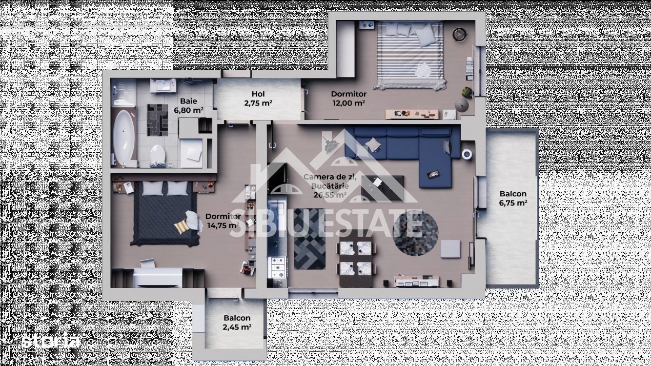 Apartament modern cu 3 camere - confort, eficiență și calitate în zona Calea Șurii Mici, Sibiu Descoperă un apartament spațios și bine compartimentat, situat într-un ansamblu rezidențial nou, ce îmbină confortul urban cu liniștea unei zone aflate în plină dezvoltare. Compartimentare inteligentă: Cameră de zi cu bucătărie și loc de luat masa - 26,55 m² Dormitor 1 - 12,00 m² Dormitor 2 - 14,75 m² Baie mare - 6,80 m² Balcon 1 - 6,75 m² Balcon 2 - 2,45 m² Loc de parcare inclus în preț Dotări și finisaje incluse: Ușă metalică de acces Tâmplărie PVC Salamander cu geam termopan Low-E (3 foi de sticlă, 5 camere) Glafuri interior-exterior Centrală proprie în condensare Saunier Duval + senzor de gaz Distribuitor pentru instalația de încălzire Încălzire în pardoseală Pereți tencuiți, gletuiți și zugrăviți în lavabilă albă (2 straturi) Șapă mecanizată Instalații electrice, TV, internet trase pe poziție Interfon Racorduri apă-canal și gaz metan (bucătărie, baie) Spații comune finisate la cheie: Ușă de acces PVC cu sistem electromagnetic Interfon cu cartelă Casa scării placată cu gresie, balustradă inox Zugrăveli lavabile și iluminat cu senzori de mișcare Lifturi moderne pentru fiecare scară Alei și trotuare pavate, spații verzi amenajate Iluminat stradal și străzi interioare asfaltate Preț: 124.750 euro Zona Calea Șurii Mici - o alegere excelentă pentru cei care caută proximitate față de oraș, dar și liniște, spațiu și confort într-un mediu modern. Imaginile sunt cu titlu de prezentare. Sibiuestate - Casa ta, povestea noastră.