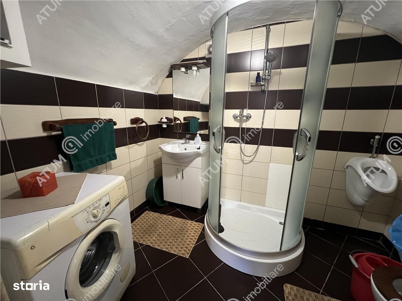 De vanzare casa individuala pe un singur nivel, compusa din 4 camere+ anexe si crama, construita pe un teren generos de 1300 mp, localizata in zona Turnisor din Sibiu. Casa are regimul de inaltime Demisol+Parter+Pod a fost edificata in anul 1962 pe structura portanta din zidarie din caramida, dispune de izolatie termica exterioara din polistiren expandat de 10 cm, acoperis tip sarpanta cu invelitoare din tigla, plansee din beton armat si lemn, subzidire si hidroizolatie. Amprenta la sol a casei este de 165.60 mp la care se mai adauga amprenta spatiilor de depozitare ( anexe ), o sura de aproximativ 100 mp si o filigorie de 33 mp construiti, totalizand 350 mp construiti si 950 mp de teren cu deschiderea la strada de 17 m. Terenul liber este amenajat cu pavaj din dale, zone betonate, zone verzi decorative amenajate cu flori si arbusti. Suprafata utila a casei masoara de 216 mp, care sunt distribuiti pe Parter si Demisol. Parterul masoara 140,87 mp, acesta fiind compus din 4 camere generoase cu suprafete de 22.96 mp, 22.63 mp, 22.43 mp, 20.00 mp, hol de acces+ casa scarii 12.56 mp, al doilea hol de 10.28 mp, baia 6.10 mp dotata cu geam de aerisire iar ca si corpuri separate cu intrari separate, o camara de 7 mp de unde se poate face accesul in pod si bucataria de 15.91 mp Demisolul are suprafata utila de 60,84 mp si amenajat ca si crama, fiind alcatuit dintr-o camera de 35.54 mp, o bucatarie de 9,25 mp, baia de 4,96 mp dotata cu cabina de dus si holul de acces 11,09 mp. Separat de suprafata utila a casei mentionam si pivnita de 17 mp, o terasa de 16,80 mp si o filigorie de 33 mp edificata pe structura din beton si zidarie din caramida unde dispune de gratar zidit, cuptor de paine, rotisor si afumatoare. Din punct de vedere al dotarilor si al finisajelor imobilul dispune de: centrala proprie pe gaz si calorifere+ incalzire in pardoseala iar ca si sursa auxiliara de caldura soba de la demisol faciliteaza procesul de incalzire, tamplarie PVC cu geam termopan 5 camere 3 foi de sticla, usi de acces din PVC, zugraveli in vopsea lavabila alba, pardoseli placate cu parchet laminat, dusumea si gresie, instalatie electrica si termica din cupru, pereti placati cu faianta, usi interioare din lemn. Imobilul are disponibilitate imediata si se preda complet mobilat si utilat. Din punct de vedere al pozitionarii acesta este situat in plan secundar fata de artera principala, strada Eduard Albert Bieltz, pe o strada linistita, lipsita de zgomot si praf datorat traficului. In imediata apropiere regasim magazine alimentare, statii de transport in comun, loc de joaca pentru copii institutii de invatamant. Valoare de achizitie este de 500.000 euro negociabil, acesta poate fi achizitionata si prin accesarea unui credit bancar. ID intern: 3154.