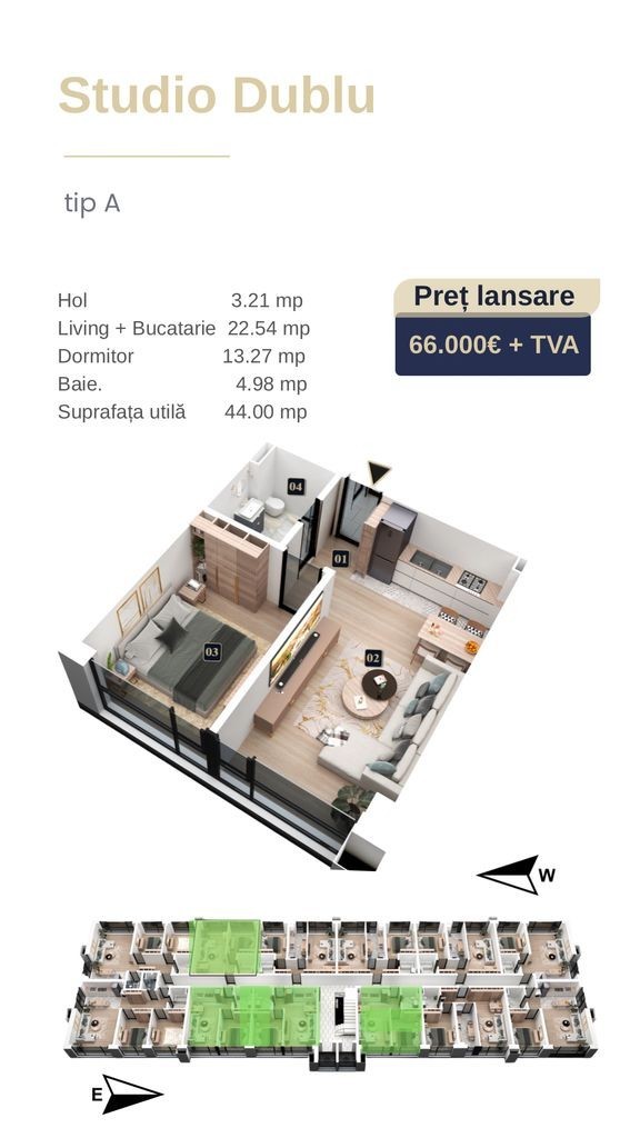 Apartament tip studio de 44 mp, cu 2 camere, situat în ansamblul rezidențial West Avenue Residence din Chiajna, strada Steleor nr. 50. Locuința beneficiază de finisaje premium, încălzire prin pardoseală, centrală proprie, aer condiționat și băi complet utilate. Construcția este realizată pe structură de beton armat, cu fațadă ventilată și tâmplărie Salamander tripan, pentru eficiență energetică și izolație fonică superioară.