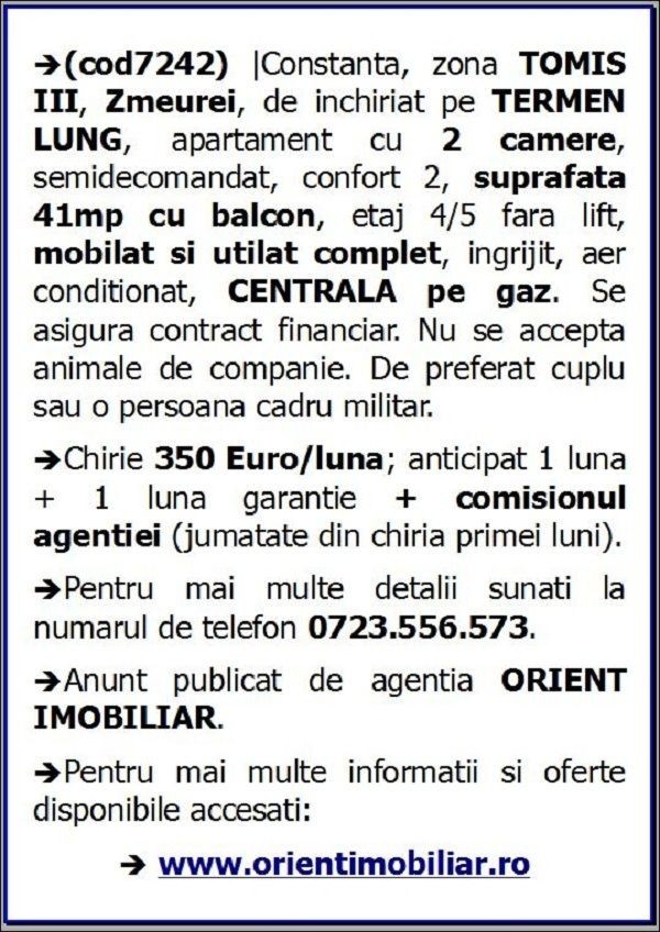 (cod7242) | Constanta, zona TOMIS III, Politia de Frontiera, de inchiriat pe TERMEN LUNG, apartament cu 2 camere, semidecomandat, confort 2, suprafata 41mp cu balcon, etaj 4/5 fara lift, mobilat si utilat complet, ingrijit, aer conditionat, CENTRALA pe gaz. Se asigura contract financiar. Nu se accepta animale de companie. De preferat cuplu sau o persoana cadru militar.