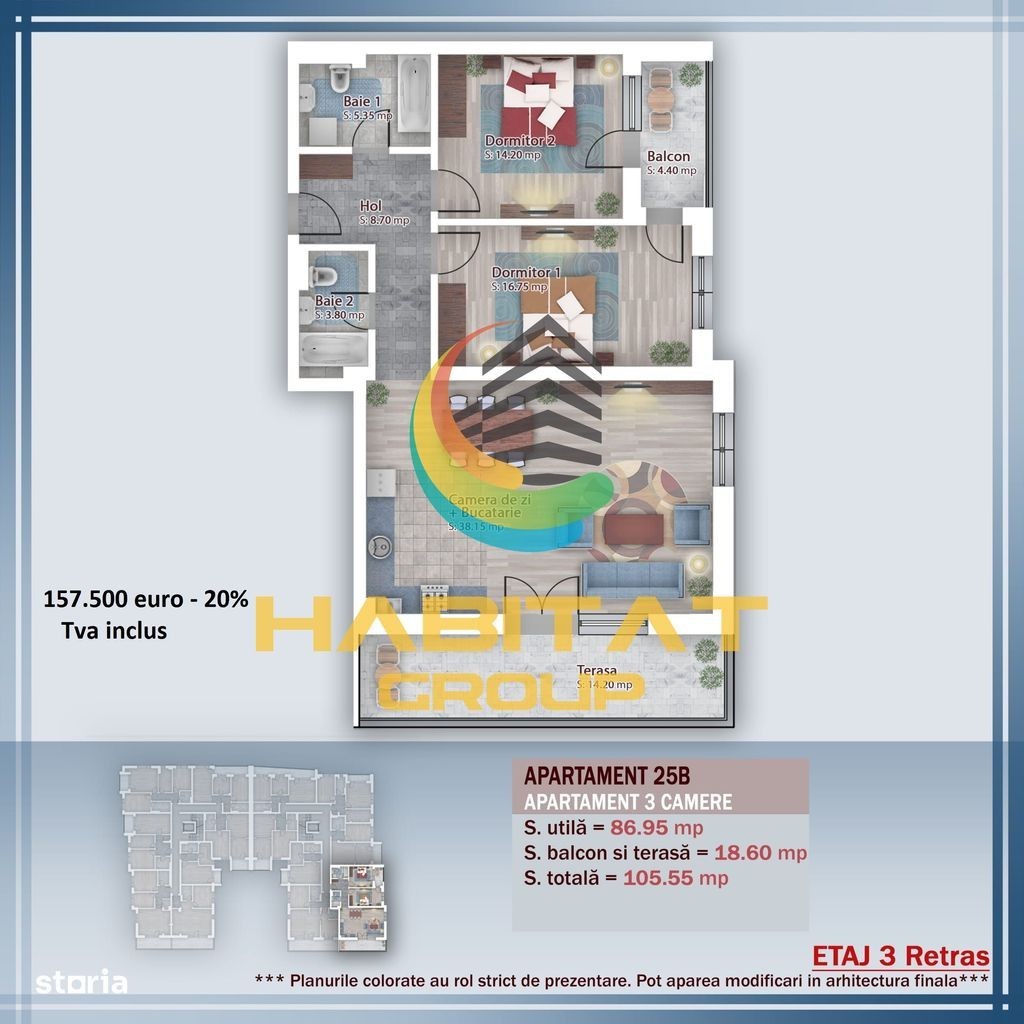 Locuința ideală pentru familia ta! Apartament spațios cu 3 camere, 2 băi, bucătărie openpace, terasa de 14.2 mp si un balcon de 4.4 mp. Situat la etajul 3 din 4, într-un imobil modern prevăzut cu lift, acest apartament îmbină perfect confortul, funcționalitatea și eleganța. Detalii generale: Suprafață totală: 105.55 mp Suprafață utilă interioară: 86.95 mp 3 camere 2 băi complet echipate Bucătărie open space Terasa: 18.6 mp Balcon: 4.4 mp Etaj 3/4, bloc prevăzut cu lift Dotări premium incluse: Parchet laminat elegant Gresie și faianță de calitate superioară Tâmplărie PVC cu geam termopan Ușă metalică securizată Centrală proprie în condensație de 24 kW Încălzire în pardoseală pentru un confort termic superior Branșamente la toate utilitățile (Enel, Engie, Apanova) Se va preda „la cheie”, complet finisat și pregătit pentru mutare. Finalizare proiect: 2026 - Rezervă-ți acum apartamentul potrivit stilului tău de viață! Preț: 130.165 euro + TVA (21%) - avans 20% la antecontract Pozele sunt cu titlu de prezentare. Locație: Strada Poștașului nr. 29, Sector 3 Waze: Habitat Group Estate Program vizionări: Luni - Vineri: 10:00 - 18:00 Sâmbătă: 10:00 - 14:00 Contact: Daniel Manea -