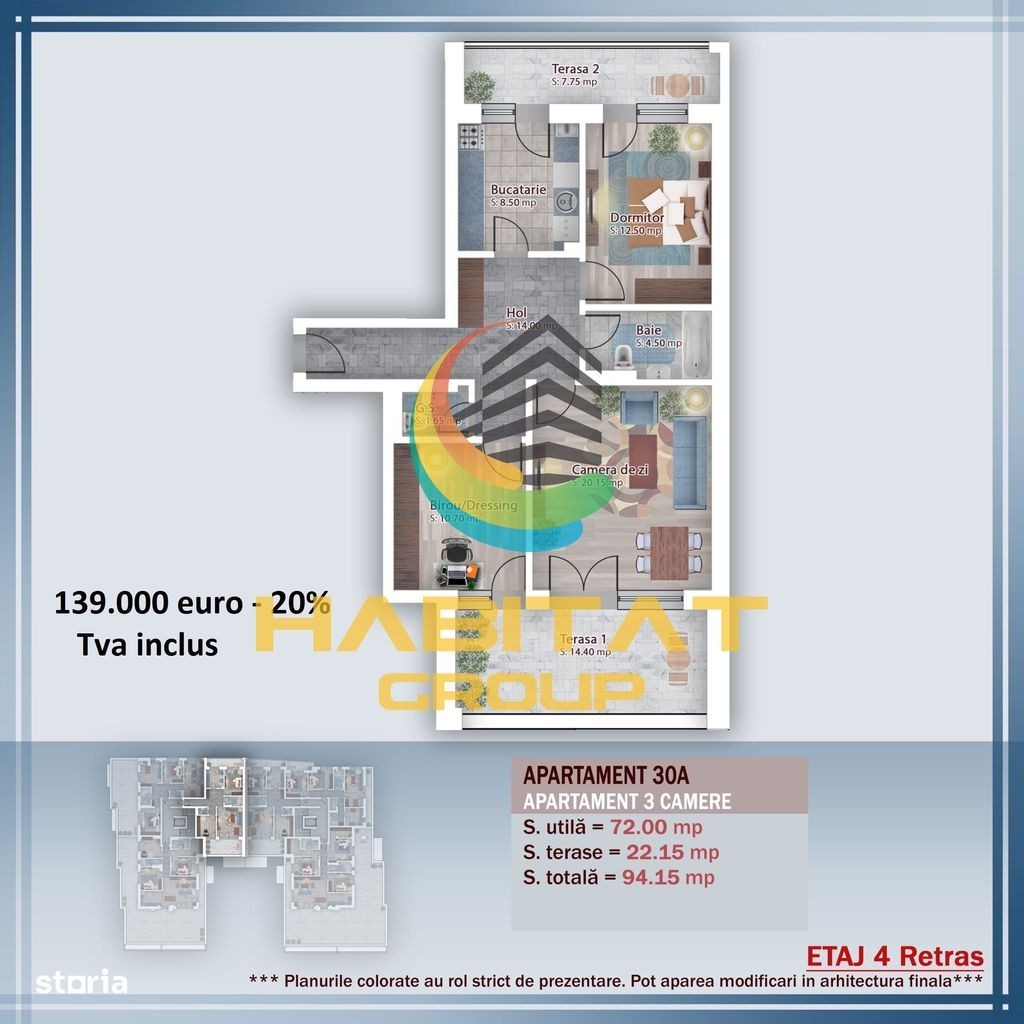 Locuința ideală pentru familia ta! Apartament spațios cu 3 camere decomandat, 2 băi, bucătărie închisă și două balcoane generoase de 7,75 mp și 14,40 mp. Situat la etajul 4 din 4, într-un imobil modern prevăzut cu lift, acest apartament îmbină perfect confortul, funcționalitatea și eleganța. Detalii generale: Suprafață totală: 94,15 mp Suprafață utilă interioară: 72 mp 3 camere decomandate 2 băi complet echipate Bucătărie închisă Două balcoane: 7,75 mp și 14,40 mp Etaj 4/4, bloc prevăzut cu lift Dotări premium incluse: Parchet laminat elegant Gresie și faianță de calitate superioară Tâmplărie PVC cu geam termopan Ușă metalică securizată Centrală proprie în condensație de 24 kW Încălzire în pardoseală pentru un confort termic superior Branșamente la toate utilitățile (Enel, Engie, Apanova) Se va preda „la cheie”, complet finisat și pregătit pentru mutare. Finalizare proiect: 2026 - Rezervă-ți acum apartamentul potrivit stilului tău de viață! Preț: 114.876 euro + TVA (21%) - avans 20% la antecontract Pozele sunt cu titlu de prezentare. Locație: Strada Poștașului nr. 29, Sector 3 Waze: Habitat Group Estate Program vizionări: Luni - Vineri: 10:00 - 18:00 Sâmbătă: 10:00 - 14:00 Contact: Daniel Manea -