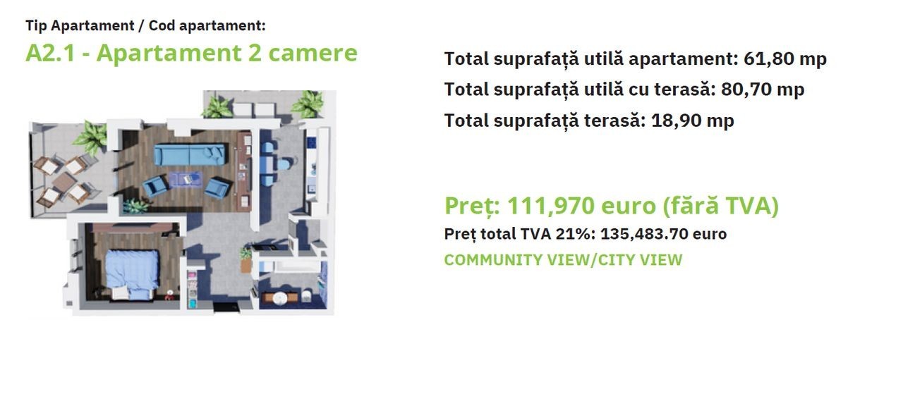 C/15561 Speed Imobiliare vă propune spre vânzare două tipuri de apartamente cu 2 camere, situate în complexul Green Residence, pe strada Livezeni, în cartierul Tudor. Apartamentele au suprafețe cuprinse între 72.80 și 80.70 mp și vor fi predate în martie 2026, în stadiul finisat complet. Fiecare apartament este dotat cu centrală proprie, încălzire în pardoseală, și.