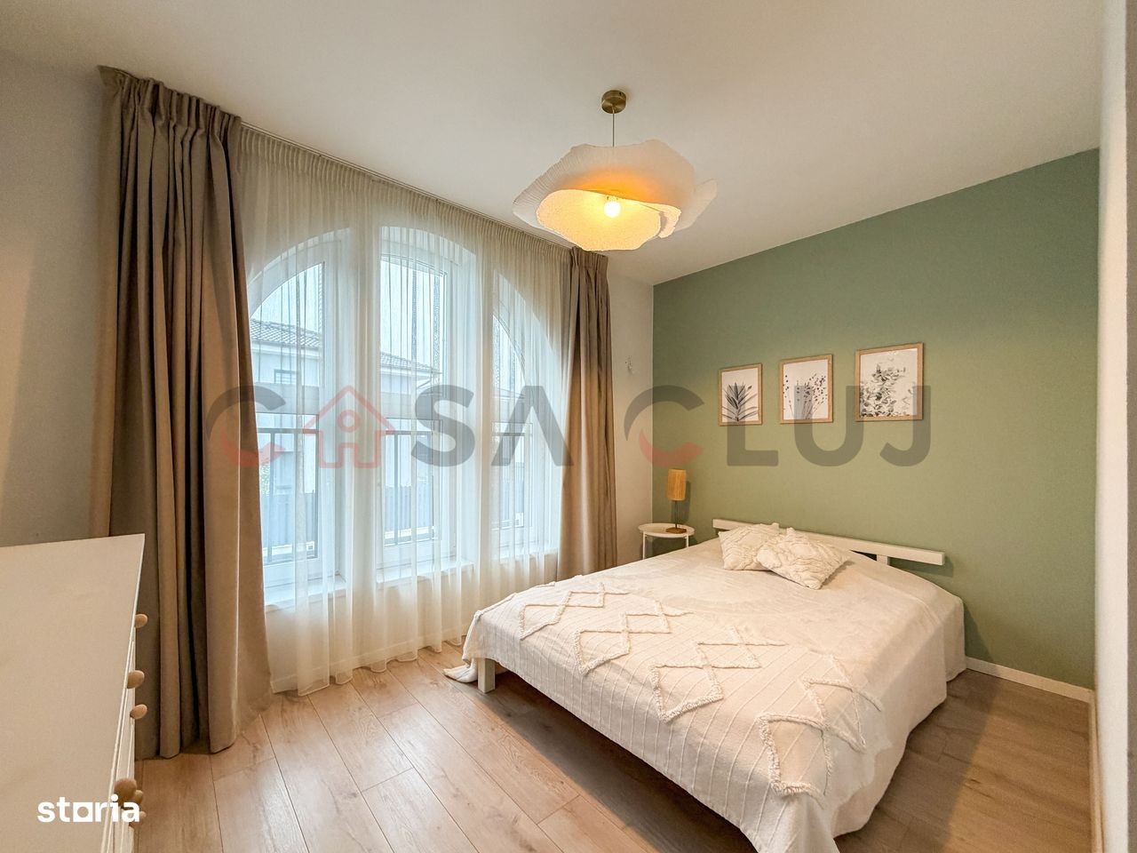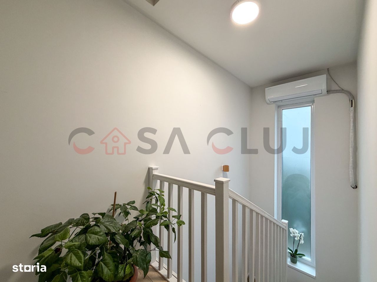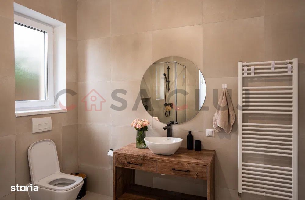 Casă individuală modernă, P+E, cu 126 mp utili și teren de 500 mp, amplasată într-o zonă liniștită din perimetrul străzii Cloșca, pe stradă asfaltată și iluminată. Proprietatea oferă o panoramă largă spre aeroport și acces rapid la stația de autobuz aflată la doar cinci minute de mers pe jos. Locuința dispune de trei locuri de parcare pavate, curte amenajată și o terasă generoasă, perfectă pentru momente de relaxare. Casa este eficientă energetic, fiind dotată cu panouri fotovoltaice și încălzire în pardoseală la ambele niveluri, ceea ce asigură costuri reduse și confort constant. Parterul cuprinde un hol spațios, un living luminos cu deschidere spre terasă, o bucătărie utilată, o baie și un spațiu de depozitare sub scară. La etaj se află dormitorul matrimonial cu dressing și baie proprie, două dormitoare suplimentare, baia principală, o cameră tehnică și acces către pod, completate de un balcon cu vedere panoramică. Proprietatea combină spațiul generos cu un design contemporan și dotări orientate spre economie și confort, fiind o alegere excelentă pentru o familie care își dorește o locuință practică și primitoare în zona Cloșca, aproape de școli, magazine și transport public.