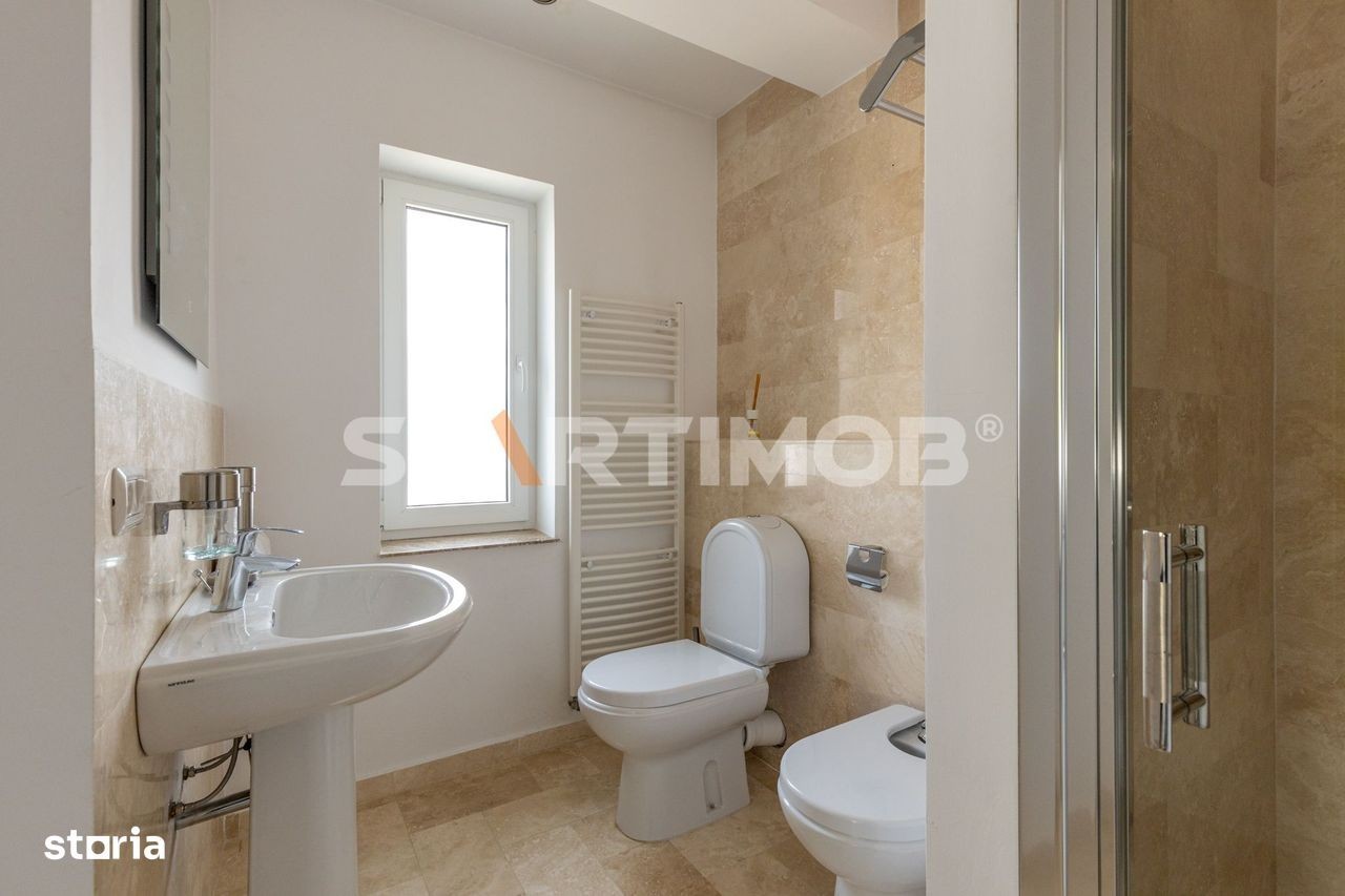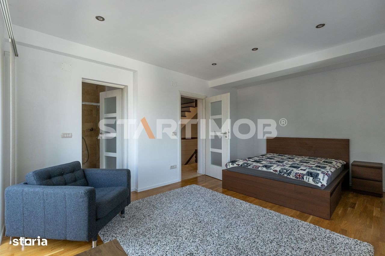 STARTIMOB va propune spre inchiriere in Reprezentare Exclusiva si cu Comision zero din partea chiriasului, o vila tip duplex, amplasata intr-un cartier rezidential din cartierul Noua ce dispune de paza permanenta si acces control, monitorizat video, paza privata, are acces facil catre Hyperrmarket-uri, scoli, gradinite, parcuri si mijloace de transport in comun si access imediat - adica 5 minute - la DN 1 si Centura Brasov. Duplexul a fost construit integral din caramida si beton, fiind finalizat in 2019, este de tip D+P+E1+M, are o suprafata de 290 mp construiti si o arie utila de 270 mp, avand o compartimentare utila si functionala fiind compus din 3 dormitoare, 3 bai complete, 2 camere de zi, 1 baie pentru camera de zi, terasa de 20 m2, 1 bucatarie principala la parter, 1 bucatarie secundara la mansarda, 2 balcoane spatioase si 1 balcon francez la mansarda. La demisol sunt pozitionate utilitatile: camera centralei termice, camera spalatorie cu grup sanitar, antreu si garaj. Proprietatea se inchiriaza mobilata si utilata, are o pozitionare sud-vestica, dispune de spatii vitrate mari ce beneficiaza de multa lumina naturala, finisaje moderne de calitate superioara, incalzirea este realizata cu centrala Buderus in condensatie separata pe fiecare nivel, are baile utilate si bucatariile mobilate si echipate cu electrocasnice, usa automata la garaj, usa metalica la intrare, supraveghere video, conexiune realizata pentru internet si cablu, tamplarie PVC cu geam termopan, parchet stejar stratificat in camere, bai placate in travertin, izolatie exterioara cu polistiren de 10 cm, acoperis cu invelitoare din tigla, pavaje exterioare cu granit si gradina amenajata cu gazon. Performanta energetica: -Clasa Energetica/ A Consumul anual specific de energie/ 121,91 Indice de emisii echivalent CO2/ 25, 66 Casa este ideala pentru o familie care isi doreste o locuinta noua, moderna, spatioasa, dar ferita de zgomote si aglomeratia urbana si totusi foarte aproape de zonele de interes din Brasov. Se solicita contract ferm si garantat pe minim doi ani, chiria in avans pe prima luna si o garantie in cuantumul a doua chirii lunare. Pret inchiriere : 1500 Euro /luna. Utilitatile se platesc separat de pretul chiriei in functie de consumul lunar. Nu se accepta fumatori si animale de companie in spatiul interior inchiriat. Detalii la nr. de telefon :