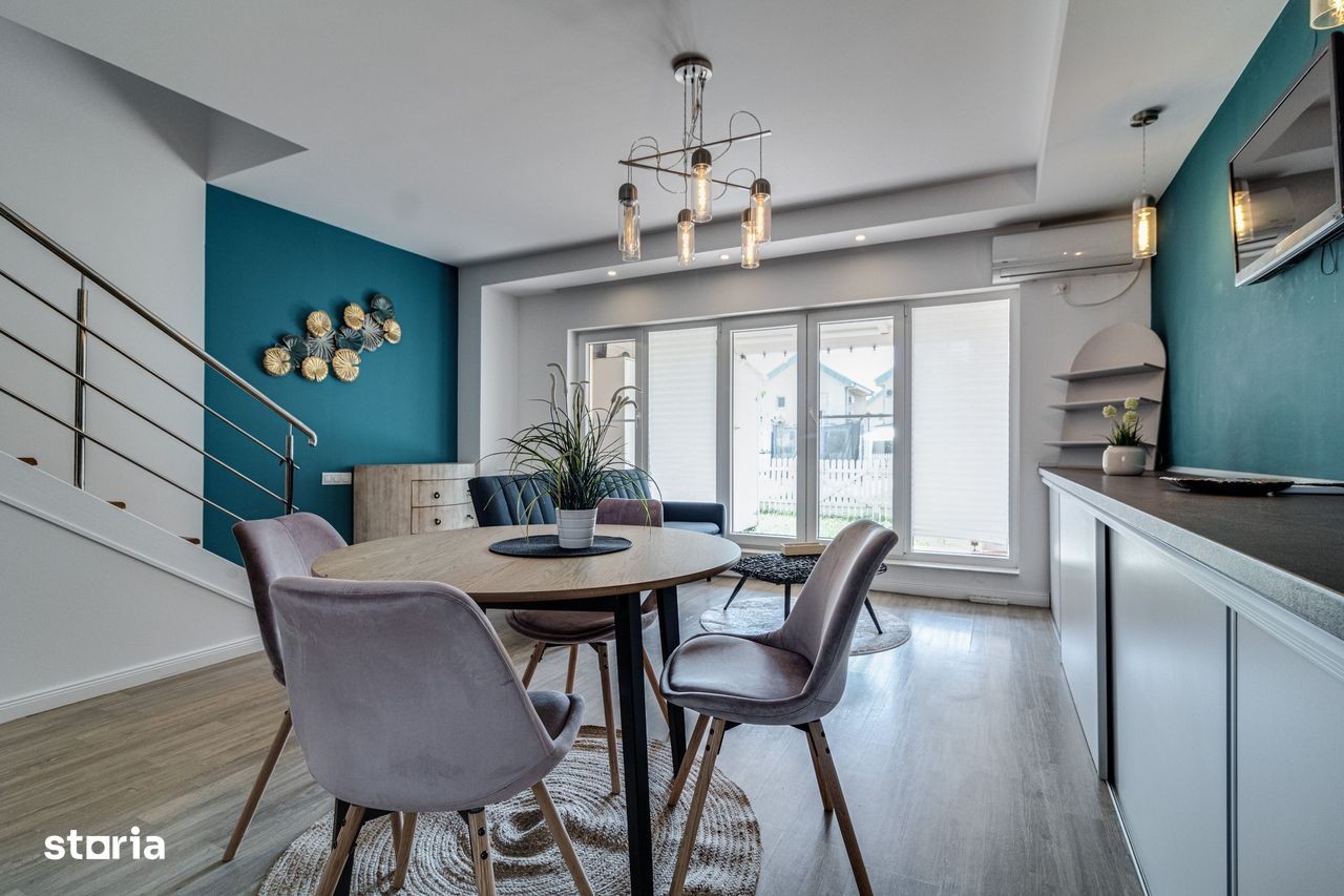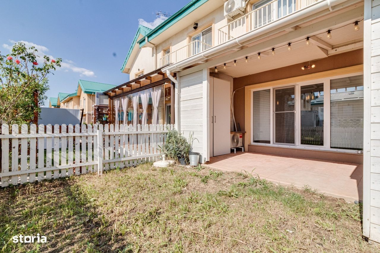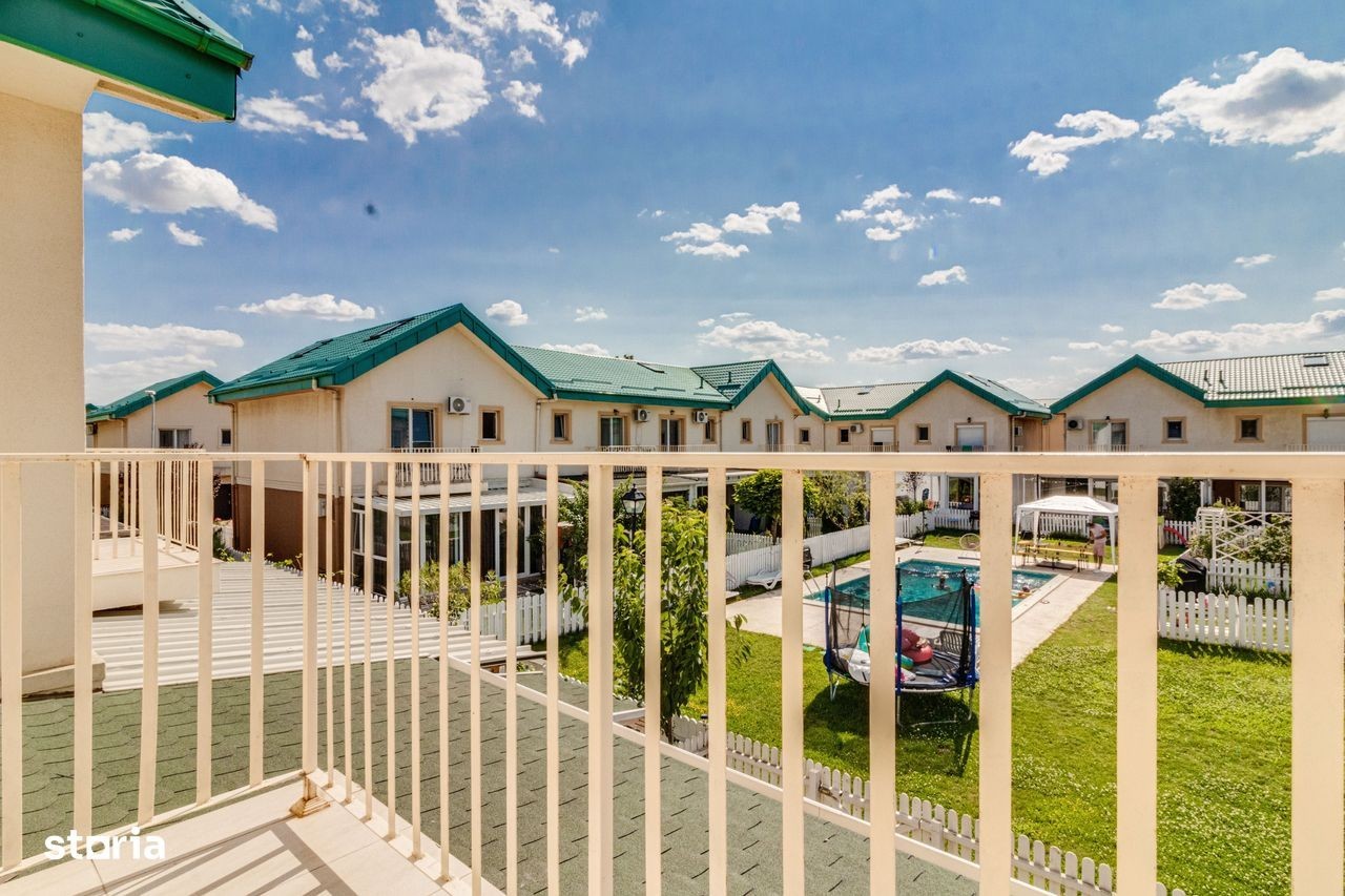 Vila cu 4 camere situată in complexul Cosmopolis ! Compartimentata astfel: Parter: hol intrare, baie de serviciu,living, bucatarie open space; Etaj: 2 dormitoare, dressing, baie; Mansarda: zona amenajata open space cu multiple spatii de depozitare; Incalzire in pardoseala; Centrala proprie pe gaz; Aer conditionat; Masina de spalat vase; Curte cu o suprafata de 40 mp cu acces catre piscina