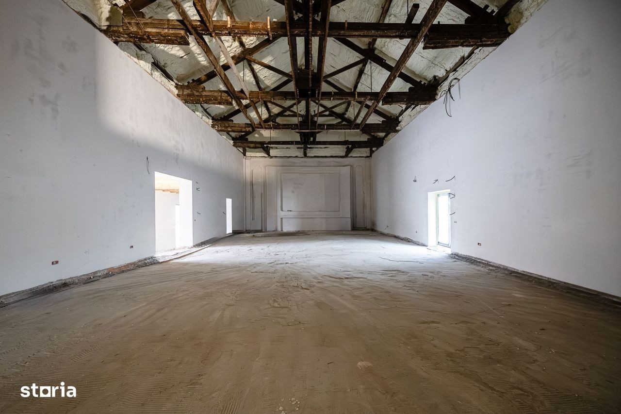 CINEMATOGRAF DE ÎNCHIRIAT - Timișoara Spațiu generos, complet renovat, cu multiple posibilități de amenajare - ideal pentru cinematograf / sală evenimente, dar și pentru restaurant, sală de fitness, clinică medicală, showroom sau activități culturale/corporate. Imobilul este dispus pe parter + etaj parțial (P+E parțial) și beneficiază de toate utilitățile. Suprafețe & amplasament Teren intravilan 1.229 mp, împrejmuit Construcție destinată „Cinematograf P+E parțial”, regim 2 niveluri, cu S. construită la sol 630 mp și S. construită desfășurată 762 mp Suprafață utilă (conform proprietar): 610 mp Compartimentare (orientativ, conform planuri): Parter: zonă mare tip sală/showroom (201,61 mp, H liber ~ 6,00 m), birouri (54,62 mp), bucătărie (20,02 mp), hol intrare, grup sanitar și spații auxiliare; există și o sală training (58,18 mp) + alte spații ce pot fi adaptate în funcție de destinație Etaj (parțial): sală ședință (36,34 mp), birouri, baie, cameră depozit și terasă exterioară (6,69 mp) Avantaje pentru chiriaș Spațiu versatil, pretabil pentru amenajări comerciale/medicale/sport/culturale Curte/teren generos (potențial pentru acces, terasă, aprovizionare, parcare - în funcție de proiect) Înălțime mare în zona principală (potrivită pentru sală evenimente, scenă, ring, aparatură fitness etc.)