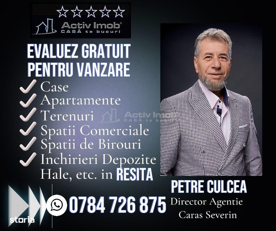 BENEFICII PENTRU CLIENTII ACESTEI OFERTE:Onorariu ZERO pentru chirias! Pret 8,5 euro mp.Vezi 9 poze pe site-ul oficial de imobiliare al orasului resita.activ imob.ro ofertele Brokerului Imobiliar Daniel Serban. Agentia Imobiliara Activ Imob Caras Severin va ofera spre inchiriere cladire, constructie separata din caramida si beton armat, pe 3 nivele amplasata pe teren privat, localizata central in Loc.Resita langa Magazinul Penny, avand urmatoarele caracteristici: - demisol 108 mp.utili, conform foto RLV Plan demisol. - parter 144 mp, conform foto RLV Plan Parter. - etajul 1, 102 mp. conform foto RLV Plan Etaj. - teren liber, drept, cca 350 mp. format din alee si zona de parcare auto, cca 20 de autoturisme. PARTICULARITATI: - constructie pe fundatie si structura cu placi intre nivele din beton armat, caldura asigurata de centrala industriala pe gaz, alte utilari specifice acestui gen de constructie, toate functionale. - Cladirea se inchiriaza toata la pretul de 8,5 euro mp.cu usoare negocieri daca perioada de contract depaseste 3 ani si perioada de gratie de o luna de zile pentru instalare dupa semnarea contractului si functie de nevoia chiriasului, proprietarul poate amenaja spatiul daca perioada de contract depaseste 5 ani. - Transportul public este bine deservit, in imediata apropierea aflandu-se statiile de autobuz cu rute interne, precum si inter-judetene. Oferta de inchiriere se adreseaza investitorilor care doresc spatii pe mai multe nivele concentrate intr-un singur corp de cladire separat, pentru diverse activitati de servicii,birouri, etc. pe termen lung, chiriasul avand garantia unei colaborari de calitate, datorita transparentei in afaceri a proprietarului. Toata cladirea detine ferestre cu larga deschidere la lumina naturala, este uscata, nu sunt urme de infiltratii sau miros neplacut si este racordate la reteaua de apa, canalizare, curent 220w si gaz. Se inchiriaza insotita de documentatie, Extras de Carte Funciara, RLV,Plan de Amplasament in Zona, liber de sarcini, Certificat Fiscal fara datorii, documente ce pot fi puse la dispozitie. Daca si dumneavoastra aveti o proprietate in Resita sau in Judetul Caras-Severin si doriti sa o vindeti sau inchiriati va rugam sa sunati la numerele de telefon- Petre Culcea,Broker Imobiliar: