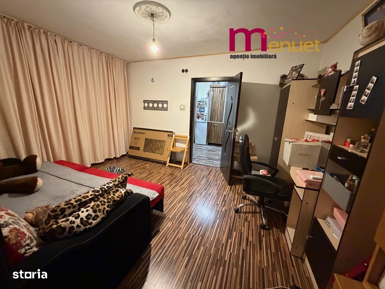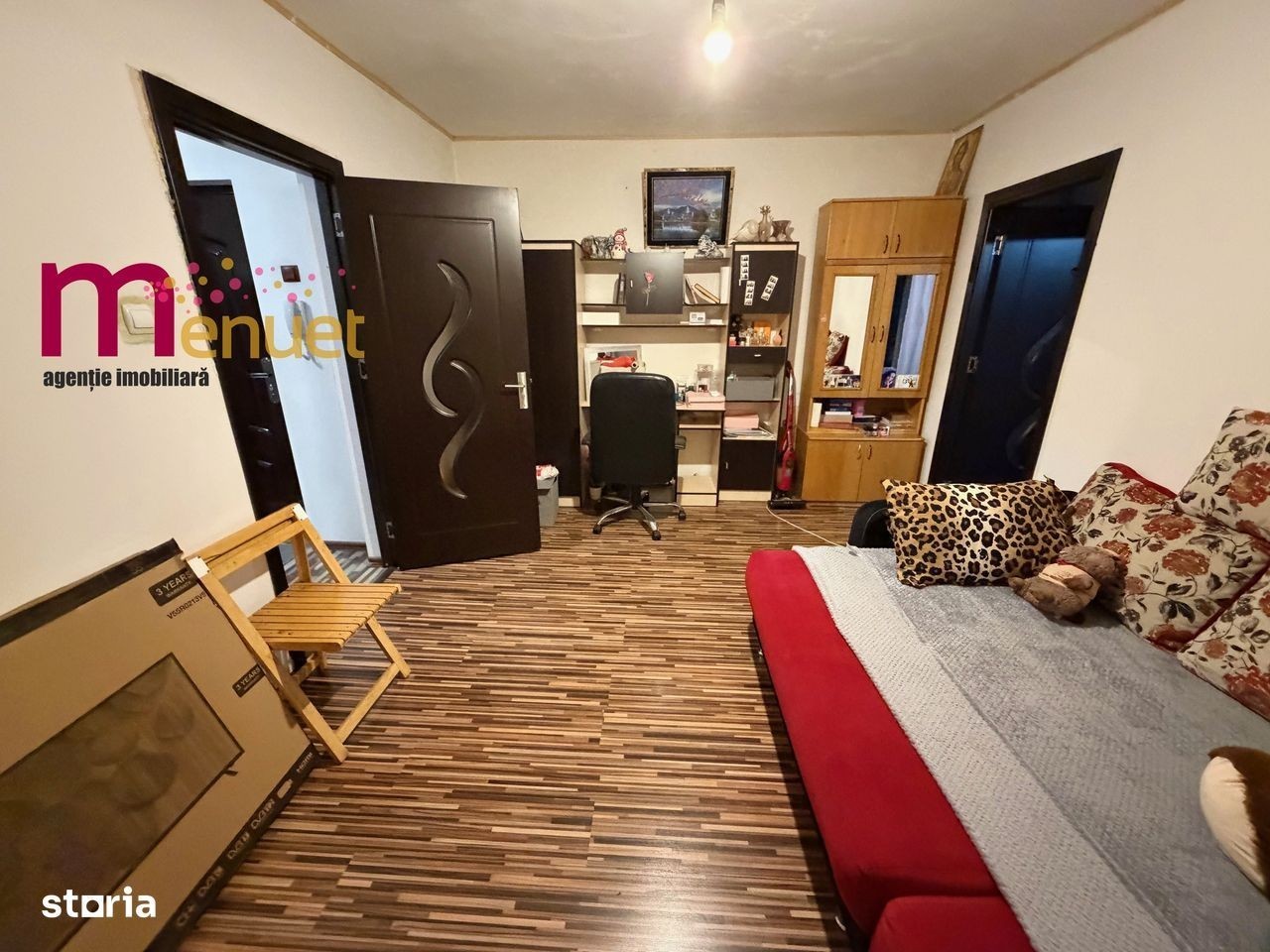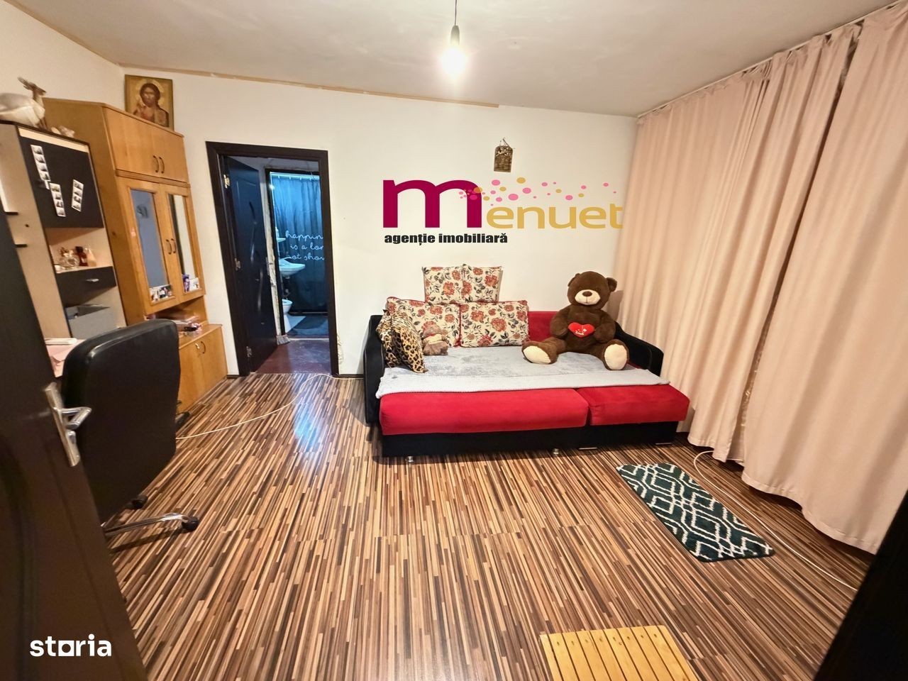 Oferim spre vanzare un apartament cu 2 camere, semidecomandat, situat la etajul 4 cu pod, pe str.Eternitatii, la R-uri. Incalzire proprie, centrala pe gaz. Suprafata totala 50 mp, cu balcon. Se vinde mobilat si utilat +TV, conform pozelor. Baia necesita renovare totala. Apartamentul este izolat exterior si detine parcare auto. Ocupabil imediat ! Scara curata cu interfon.