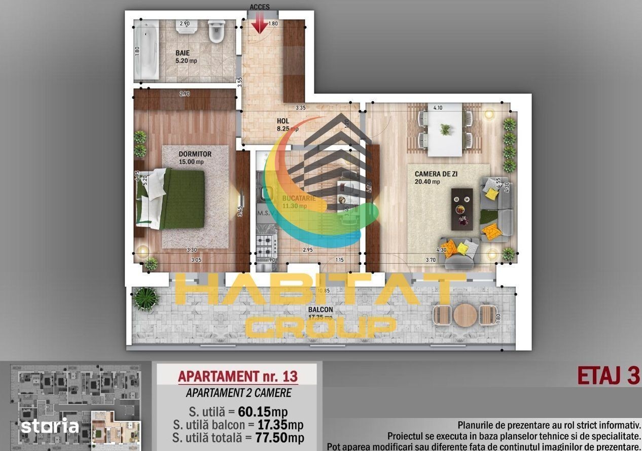 Va prezint un apartament de 2 camere, decomandat, cu terasa de 77.5 mp, cu terasa de 17.35 mp, spatios, 60.15 mp utili, cu bucatarie inchisa, spatios, unicat, construit la cele mai inalte si riguroase standarde cu finisaje de lux gata de mutare. Pozitionarea excelenta cu acces facil atat catre centrul Capitalei cat si la Autostrada Soarelui, facilitatile zonei si finisajele de lux fac din acest apartament o alegere excelent pentru oricine isi doreste mai mult de cat un apartament, ci un adevarat camin care sa ofere tot confortul si facilitatile necesare unei vieti armonioase. Constructia este realizata cu structura pe cadre, diafragme si plansee din beton armat, fundatii din beton, curva subsol din beton armat. Zidarie din caramida cu o grosime de 12,5-30 cm peste care este aplicata tencuiala uscata, glet si zugraveli cu lavabila de cea mai buna calitate si finisaje de calitate superioara. Aspect placut si deosebit. Tavanele sunt placate cu rigips, pe structura metalica. Izolare termica eficienta. Fatadele sunt placate cu polistiren cu grosimea de 10 cm - EPS 80. Acoperisul este de tip terasa necirculabil, pe placa de beton armat, bariera contra vaporilor, termoizolatia de polistiren extrudat de 20 cm grosime, hidroizolatie tip membrane Bauder in dublu strat dintre care stratul de la partea superioara este tratat contra radiatiilor solare. Pret- 129.000 euro + tva Oferim asistenta in vederea intocmirii dosarului de creditare. Pozele au titlu de prezentare. Comision 0 % Birou Vanzari