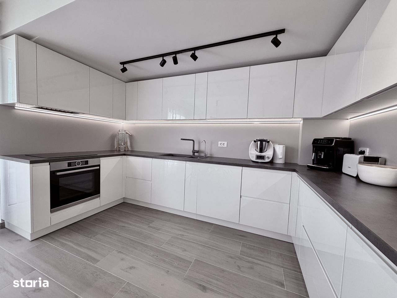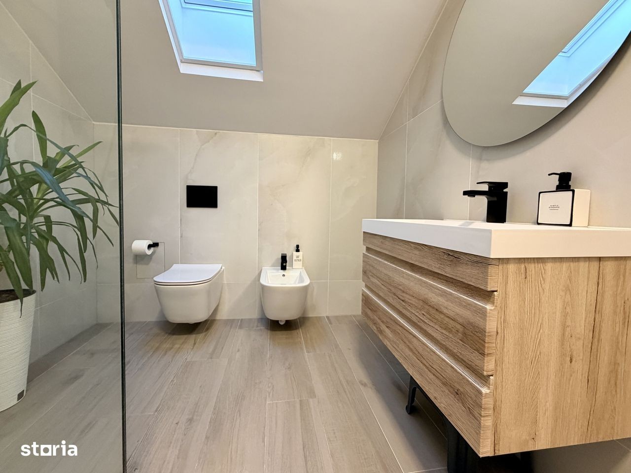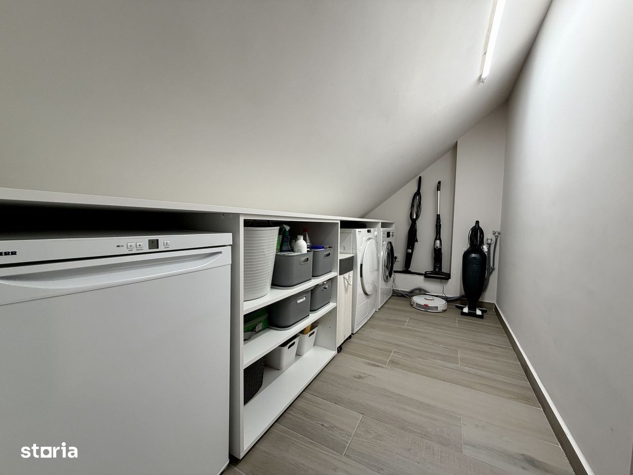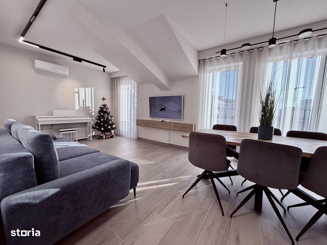 Vă prezentăm un penthouse deosebit, cu o suprafață utilă de 100 mp, completat de o terasă generoasă de 50 mp, conceput pentru un stil de viață modern, confortabil și rafinat. Proprietatea beneficiază de expunere Sud, iar toate camerele sunt orientate către Sud, fiind excelent însorite pe tot parcursul zilei, cu lumină naturală abundentă. Un avantaj major este faptul că fiecare încăpere are acces direct pe terasă, creând o continuitate firească între spațiul interior și cel exterior. Apartamentul este mobilat și utilat la standarde premium, cu atenție deosebită la detalii și calitate, într-un stil contemporan, rafinat, folosind materiale și finisaje atent alese: • Electrocasnice Bosch și Liebherr • Sistem de filtrare a apei Vatra Eco • Baterii și robineți Hansgrohe • Întrerupătoare Panasonic • Corpuri de iluminat LED • 2 aparate de aer condiționat Samsung Compartimentarea este practică și elegantă: • 2 băi, dintre care: • baie matrimonială cu cadă • baie secundară cu duș • Ambele băi dispun de aerisire naturală (geam) Confortul este completat de: • Încălzire prin pardoseală • Termostat smart pentru control eficient al temperaturii • Loc de parcare acoperit inclus Imobilul este un bloc de dimensiuni reduse, cu o comunitate restrânsă, acces securizat prin barieră, oferind liniște și intimitate. Un penthouse destinat celor care apreciază calitatea, detaliile și un nivel ridicat de confort.