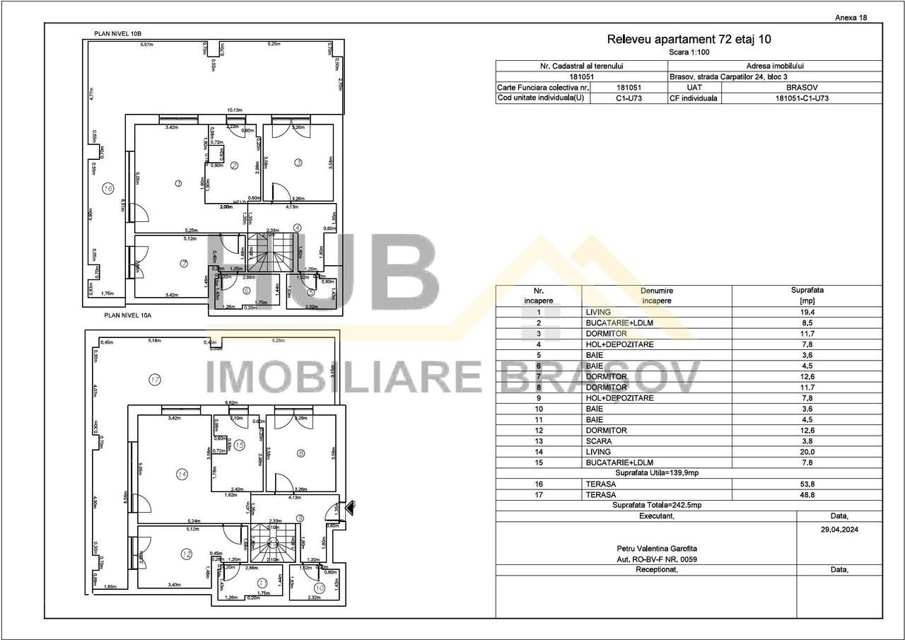 Buna ziua! George Strat consultant Hub Imobiliare Brasov, va propun spre achizitie un PENTHOUSE desfasurat pe 2 nivele, cu suprafata utila de 139.9mp si terasa de 102.6mp, situat la intrarea in cartierul Racadau, Complexul Rezidential Sunny Vile pe Str. Carpatilor, Nr. 24., Mun. Brasov. La pretul afisat se adauga TVA 21%. Un penthouse spectaculos, cu priveliște unica în inima Brașovulu! Sunny Vile, un ansamblu rezidential modern, construit cu atentie la detalii si finisaje de inalta calitate unde design-ul modern se imbina perfect cu elegana. Proiectul se afla la intrare in Racadau, la limita cu Centrului Comercial Magnolia. Se vinde la GRI conform POZELOR din anunt. Se pune la dispozitie contra cost firma de constructie pentru finalizarea finisajelor sau RECOMPARTIMENTAREA acestuia. COMPARTIMENTARE NIVEL 1 SI 2: - Hol de acces, - Living-ul tip open-space cu bucataria si o zona de dining, detine suprafete vitrate mari si acces catre terasa. - 2 dormitoare cu baie proprie, dressing si iesire pe terasa. - 2 dormitoare. - 2 bai de serviciu. - 2 terase, una pe fiecare nivel, impreuna insumand o suprafata de 29 mp. Posibilitate de RECOMPARTIMENTARE: Parter. - Living Open-Space cu Bucataria + loc de luat masa. - Depozitare. - Dormitor 1. - Baie. Etaj: - Dormitor 2. matrimonial cu Baie + Dresing. - Dormitor 3. cu Baie. - Dormitor 4. - Baie. DOTARI: - Centrala termica pe apartament. - Tamplarie PVC, ferestre cu vitraj termoizolant alcatuite din 3 foi de sticla. - Termoizolatie exterioara cu polistiren de 10 cm. - Usa de intrare metalica. - Incalzire prin pardoseala. - Instalatie electrica. Optional, se poate achizitiona un loc de parcare subteran. Va multumim si va stam la dispozitie cu detalii suplimentare despre acest imobil.