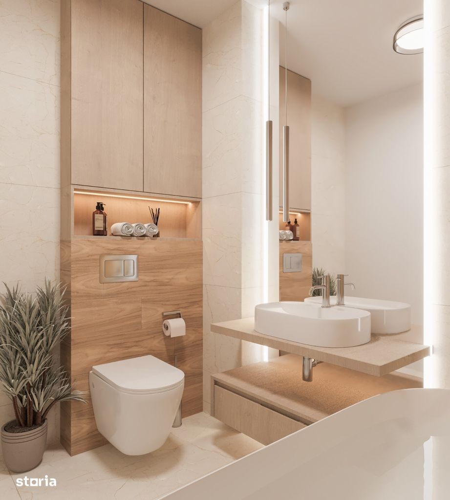 Apartamentul de 2 camere open space sau decomandat, cu o suprafață de 57 mp, oferă un echilibru perfect între funcționalitate și estetică modernă. Zona de zi este amplă și aerisită, integrând livingul și bucătăria într-un spațiu deschis, ideal pentru un stil de viață dinamic. Ferestrele panoramice mari creează o conexiune naturală cu exteriorul, iar fațada ventilată premium, încălzirea prin pardoseală automatizată și materialele de calitate superioară asigură confort pe termen lung.