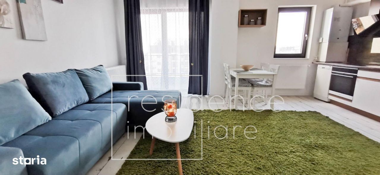Residence Imobiliare va ofera spre inchiriere un apartament situat pe Calea Baciului, intr-un imobil nou, la 1 minut de Lidl. Apartamentul se afla la etajul 4 din 6, cu lift, dispune de o suprafata utila de 57 mp, finisaje de calitate, atent alese si de o orientare sud-estica, fiind invadat de lumina. Apartamentul este compartimentat intr-un hol la intrare, de unde se face accesul intr-un living pe plan deschis cu bucataria, utilata complet, inclusiv cu masina de spalat vase, electrocasnice noi, in garantie, un dormitor cu pat matrimonial, dressing, baie cu cabina de dus walk in si o terasa generoasa cu intrare din ambele camere. Apartamentul este mobilat in culori vii, care te binedispun inca de la intrare si promite comfort viitorilor chiriasi. Dispune si de un loc de parcare subteran inclus in pret si se poate inchiria din 15 ianuarie!