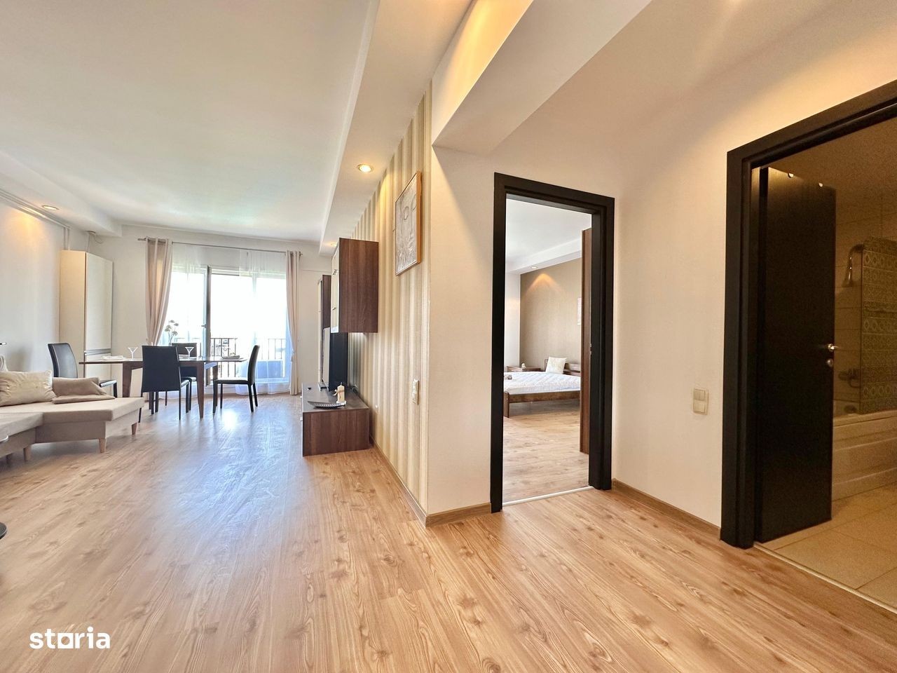 Va oferim spre închiriere un apartament cu doua camere, cu suprafata utila de 57 mp, la etajul 7/10, situat in Ansamblul Rezidential Cosmopolis. Apartamentul dispune de living generos, bucatarie complet mobilata si utilata, 1 dormitor, 1 baie, hol si 1 loc de parcare.