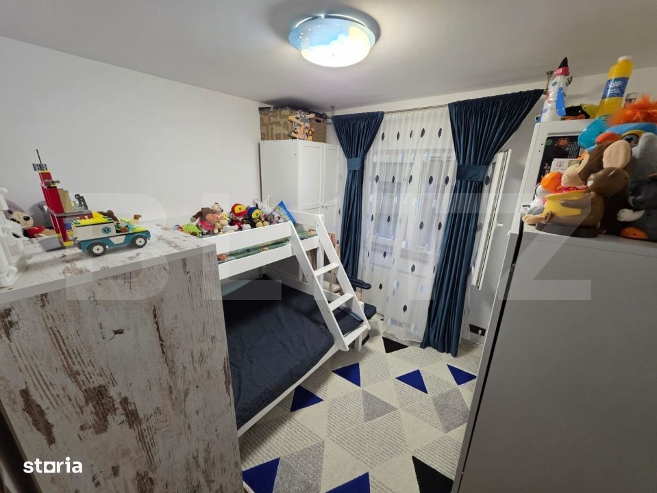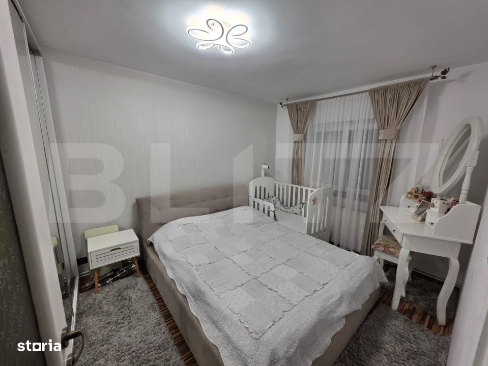 Se oferă spre vânzare un apartament modern cu 3 camere, decomandat, având o suprafață de 66,6 mp, situat într-o zonă bine conectată, cu acces facil la școli, grădinițe, parcuri și magazine.Apartamentul este compartimentat practic și cuprinde două dormitoare, un living primitor, bucătărie separată, precum și două băi. Confortul termic este asigurat de centrală termică pe condensare Ariston, nouă, cu control al temperaturii prin termostat wireless Salus, completată de aer condiționat. Pentru un ambient plăcut, livingul dispune și de un șemineu electric. Locuința beneficiază de izolație interioară și exterioară, precum și de podea izolată, aspecte care contribuie la o eficiență energetică ridicată. Este dotată cu geamuri termopan și jaluzele, iar un avantaj important îl reprezintă locul de parcare inclus.Apartamentul se vinde mobilat și utilat complet, fiind gata pentru mutare imediată.