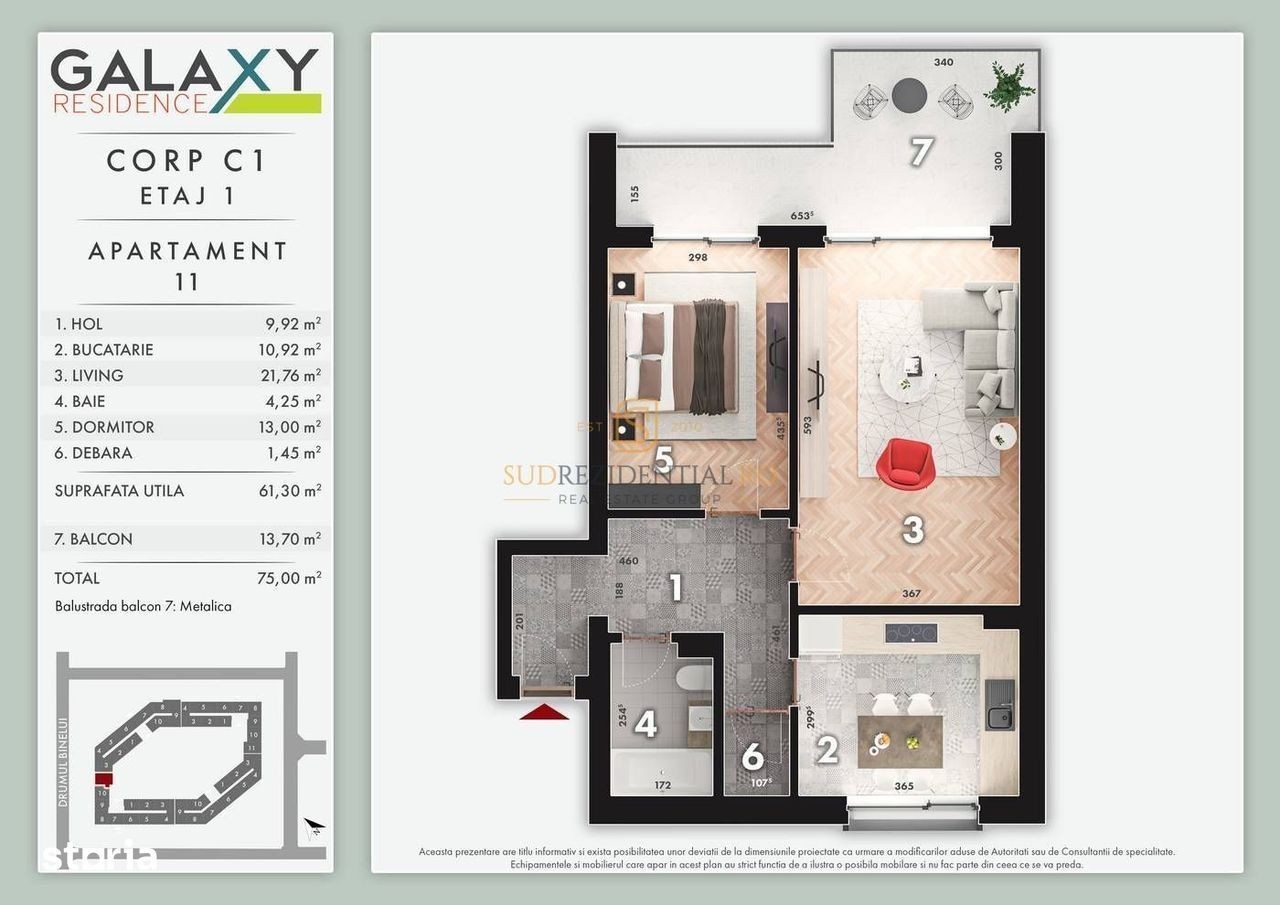 Va prezentam spre vanzare un apartament decomandat cu 2 camere, situat in cadrul complexului rezidential Galaxy Residence, un proiect modern dezvoltat in Sector 4, Bucuresti. Locuinta este gandita pentru a oferi confort, eficienta si un stil de viata relaxant, intr-o zona bine conectata la infrastructura urbana. Apartamentul are o suprafata utila de 60,14 mp, la care se adauga un balcon de 2,66 mp, ajungand la o suprafata totala de 62,80 mp. Spatiul interior este optim compartimentat pentru a asigura functionalitate maxima, dupa cum urmeaza: - Living generos - 22,97 mp - Dormitor confortabil - 12,82 mp - Bucatarie moderna - 10,21 mp - Hol spatios - 9,39 mp, cu posibilitati multiple de depozitare - Baie moderna - 4,75 mp, dotata cu finisaje premium - Balcon de 2,66 mp, accesibil din living Apartamentul este construit cu materiale de calitate superioara, avand tamplarie PVC cu geam tripan, izolatie termica eficienta si finisaje premium care asigura durabilitate si un aspect elegant. Situat intr-un ansamblu rezidential bine dezvoltat, acest apartament beneficiaza de acces rapid la toate facilitatile necesare pentru un trai confortabil: - Centre comerciale: Lidl, Kaufland, Carrefour, Auchan, Metro si Jumbo la cateva minute distanta - Transport public: statii STB in apropiere, cu acces rapid catre statia de metrou Aparatorii Patriei - Zone de agrement: Parcul Tudor Arghezi - o zona verde moderna, ideala pentru plimbari, sport si relaxare - Unitati de invatamant: scoli si gradinite in proximitate - Servicii medicale: clinici si farmacii la cateva minute distanta Pret de lista: 104.000 Euro + TVA