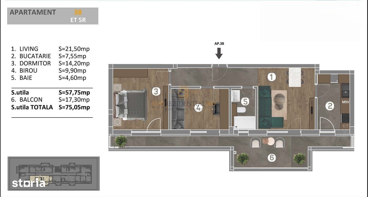 Va propunem spre vanzare un apartament cu 3 camere, situat la etajul 5 al imobilului nou din cadrul proiectului Cavar Residence Drumul Binelui, cu regim de inaltime S+P+4E+5Er. Locuinta are o suprafata utila de 57,75 mp, la care se adauga un balcon generos de 17,30 mp, rezultand o suprafata utila totala de 75,05 mp. Compartimentarea este eficienta si moderna: - Living - 21,50 mp - Bucatarie - 7,55 mp - Dormitor - 14,20 mp - Birou - 9,90 mp - Baie - 4,60 mp - Balcon - 17,30 mp Apartamentul beneficiaza de finisaje si dotari premium: incalzire prin pardoseala, centrala termica proprie de 24 kW in condensatie, tamplarie PVC Salamander cu geam tripan, balcoane/logii cu zidarie si sticla. De asemenea, rezidentii au acces la o curte comuna amenajata, un spatiu verde destinat exclusiv comunitatii. Cavar Residence Drumul Binelui este amplasat intr-o locatie excelenta, in imediata apropiere a Parcului Tudor Arghezi, o zona verde cu locuri de joaca, alei de promenada si spatii pentru sport. - Acces rapid catre centre comerciale: Grand Arena Mall, Selgros, Hornbach, Lidl, Kaufland, Carrefour, Metro, Auchan, Jumbo. - In proximitate se afla scoli, gradinite, clinici, farmacii si banci. - Transport public facil: numeroase linii STB (73, 102, 125, 141, 220, 232, 241, 312, 313, N105). - Statia de metrou Aparatorii Patriei este la doar cateva minute distanta. - Acces rapid catre Bulevardul Metalurgiei, Strada Turnu Magurele si Soseaua Berceni, cu legaturi directe spre centrul Capitalei. Pret de lista: 112.500 Euro + TVA Pret promotional pentru avans 50% din valoare imobilului, disponibil pana la 31.01.2026: 108.500 Euro + TVA
