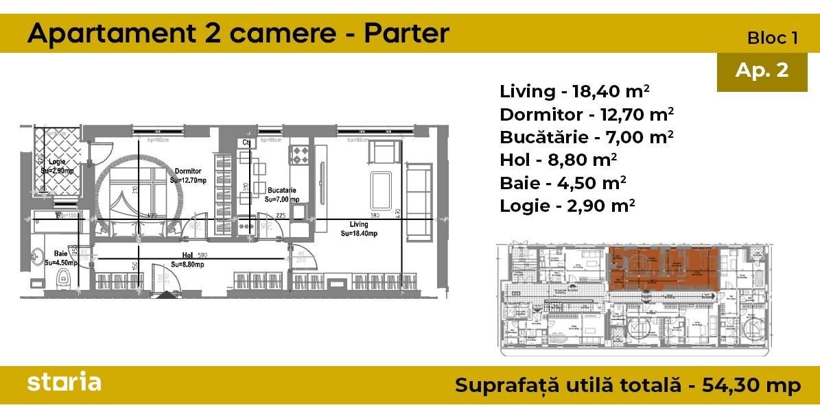 Apartament 2 camere - 54,3 mp - bloc nou P+6 Vă propunem spre vânzare un apartament modern de 2 camere, cu o suprafață utilă de 54,3 mp, situat într-un imobil nou, cu regim de înălțime P+6.