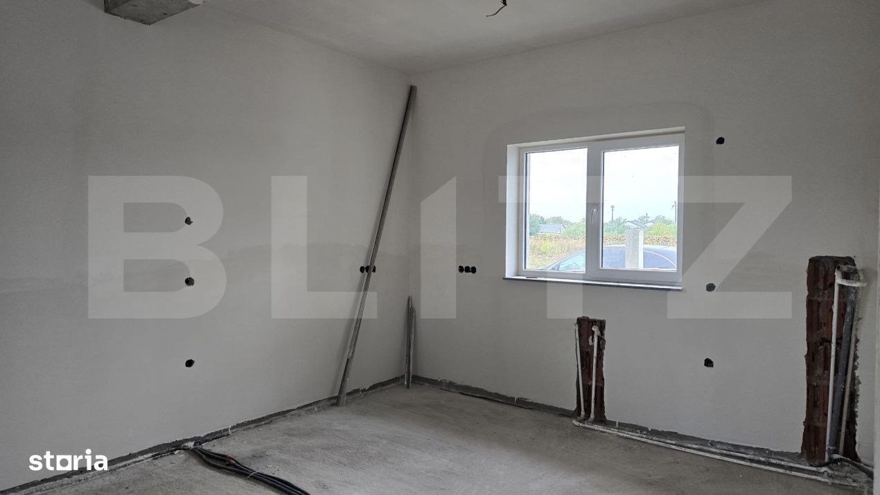 Blitz oferă spre vânzare casă modernă, compartimentată inteligent - 122 mp utili, teren 420 mp Blitz vă propune spre vânzare o casă deosebit de frumoasă, realizată la o calitate superioară, compartimentată pe două zone distincte pentru un confort sporit: Zona de zi bucătărie open-space cu camară, living generos, completat de o terasă de 18 mp, ideală pentru relaxare. Zona de noapte / relaxare 3 dormitoare spațioase, dintre care dormitorul matrimonial dispune de dressing și acces la pod, baie generoasă modern gândită. La intrarea în casă, holul este prevăzut cu o zonă amplă de depozitare și o baie de serviciu. Detalii tehnice și finisaje Suprafața utilă: 122 mp Teren aferent: 420 mp Casă semifinisată: pereți gletuiți + strat de lavabilă, Încălzire în pardoseală, Curtea împrejmuită cu gard pregătit pentru a fi finalizat după preferințele viitorului proprietar, Trotuarul și zona din jurul casei sunt pavate, Se predă cu gardul realizat în stadiu avansat și strat suplimentar de lavabilă. O locuință modernă, bine structurată, care îmbină confortul, eleganța și calitatea construcției. Pentru mai multe detalii și vizionări, vă așteptăm să ne contactați!