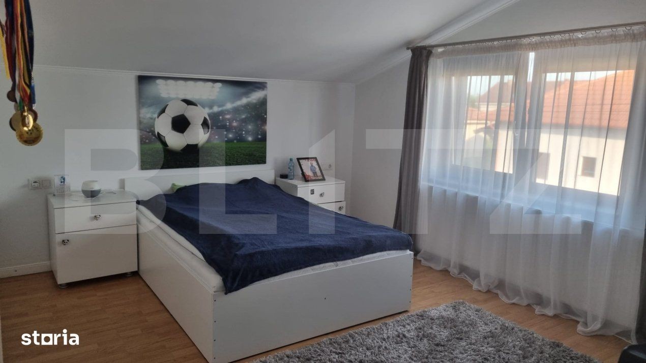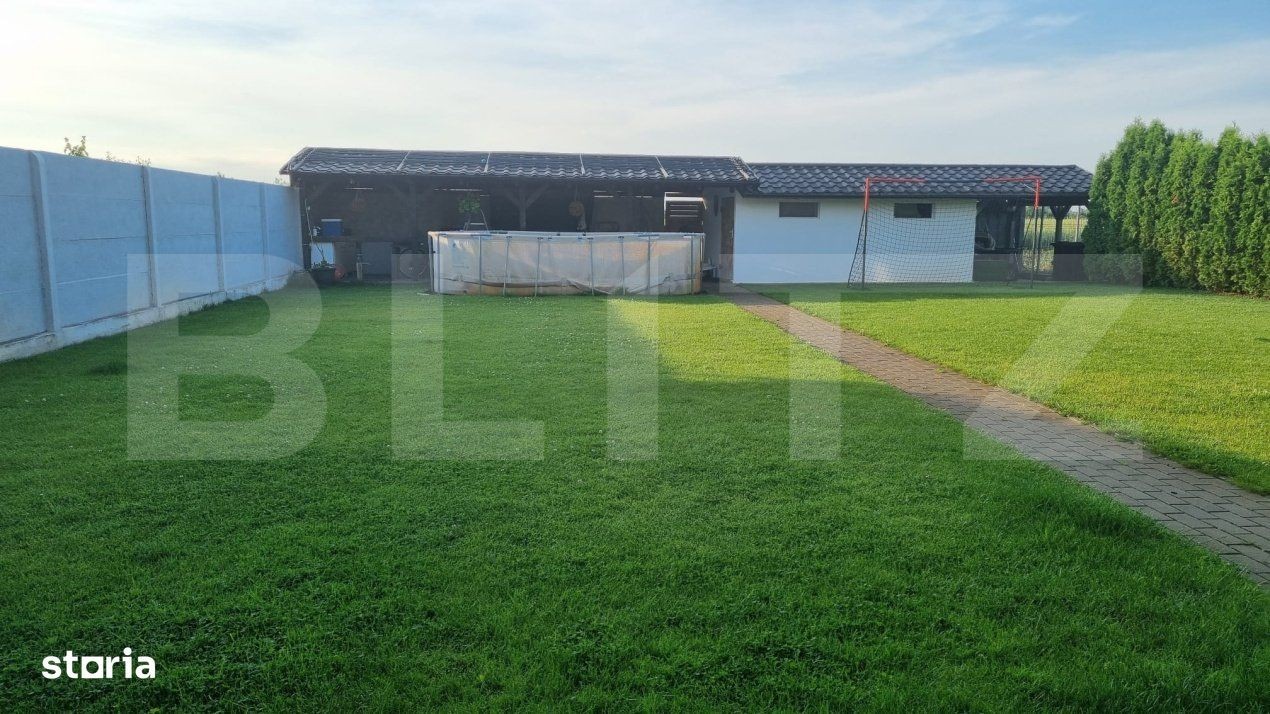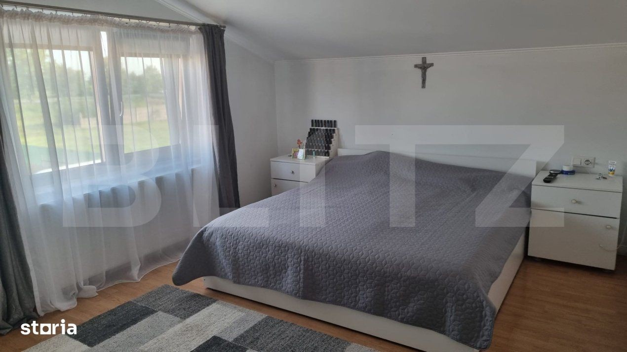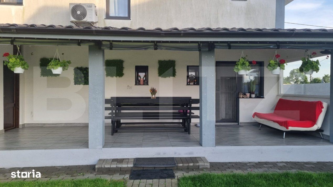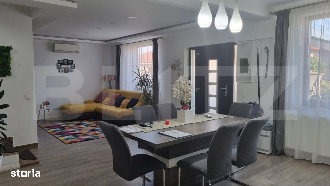 Blitz vă propune spre vânzare o casă modernă și elegantă situată într-o zonă liniștită din Vetiș, ideală pentru familii care își doresc confort, spațiu și intimitate. Caracteristici principale: Suprafață generoasă, compartimentată eficient: 4 camere luminoase Living modern în concept open space cu bucătăria, dotat cu șemineu - perfect pentru serile relaxante. 2 băi complet echipate Dressing spațios și spații de depozitare bine organizate, parter + mansardă. Exterior: Curte spațioasă, amenajată cu terasă și zonă de grill pentru barbeque. Gazon îngrijit, cu sistem de irigare. Intimitate și liniște într-un cartier bine cotat Alte avantaje: Se vinde complet mobilată și utilată, gata pentru mutare Finisaje premium și mobilier de calitate Aceasta este o oportunitate rară de a achiziționa o locuință care îmbină designul modern cu funcționalitatea și confortul.