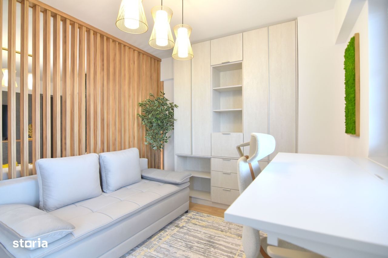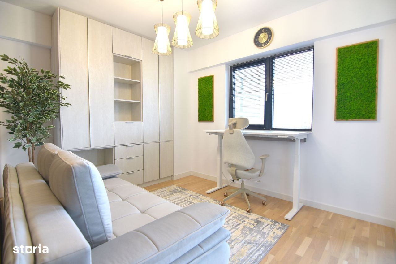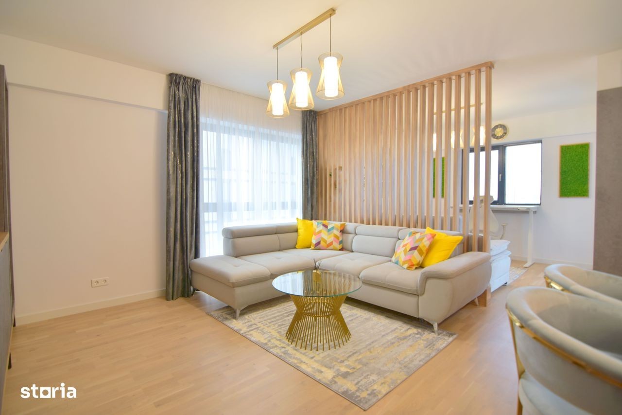 Se ofera spre inchiriere un apartament nou situat într-un ansamblu rezidențial bine plasat, cu acces facil la diverse puncte de interes. Proprietatea are o suprafață utilă de 59 mp si prezinta urmatoarea compartimentare interioară: - Spațiu de living open-space - Zonă office luminoasă cu acces la terasă - Bucătărie open-space cu zonă de dining - Dormitor matrimonial - Baie cu cada - Antreu Finisaje Premium: Parchet lemn triplustratificat, tamplărie din aluminiu cu 3 sticle, incălzire în pardoseală, Ac Mitsubishi Invertor. Facilități Ansamblu: Servicii de pază pe timpul nopții, supraveghere video 24/24. Mobilierul este realizat pe comandă pentru o eficientizare maximă a spațiului. Apartamentul se inchiriaza mobilat si utilat la pretul de 650 Euro/luna, in pret fiind inclus si un loc de parcare subteran cu acces securizat.