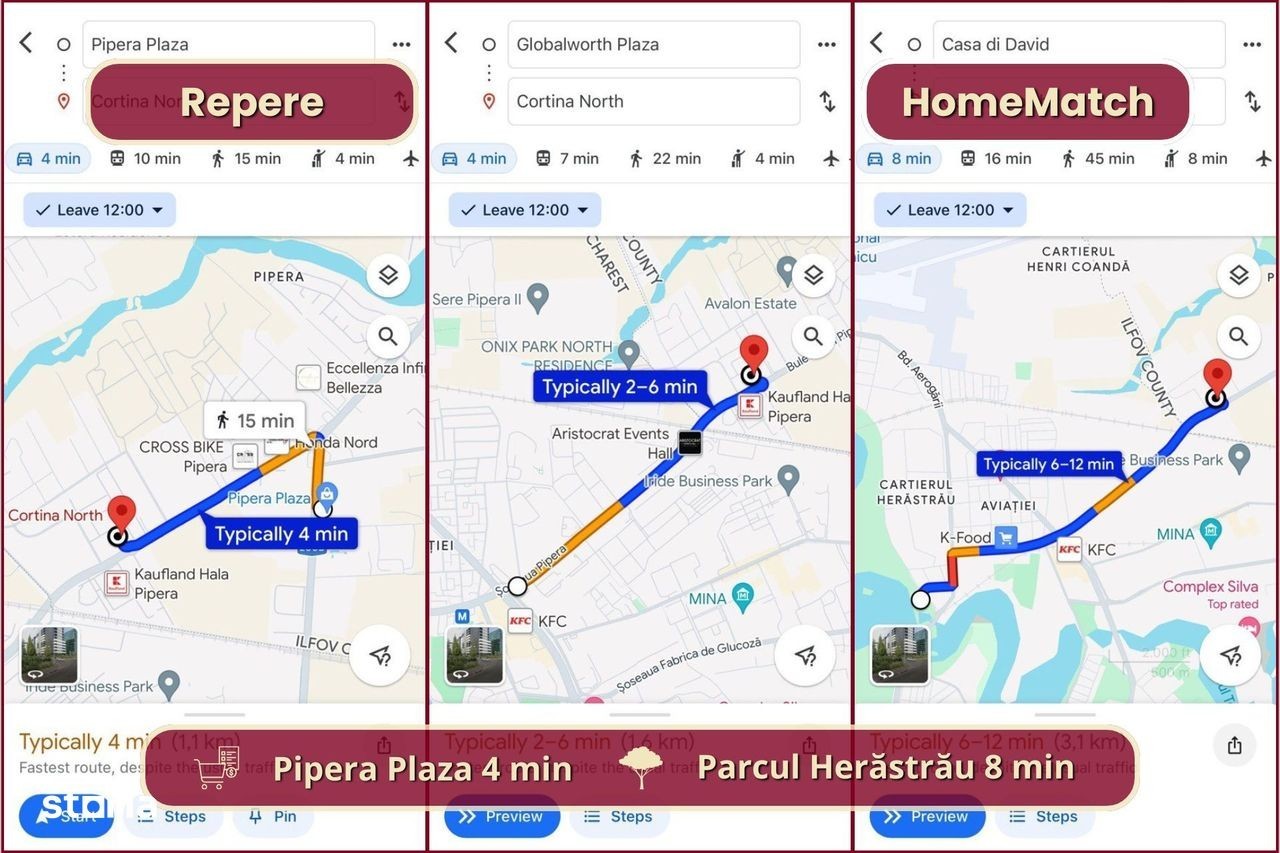 Vrei să locuiești într-un cartier exclusivist din Nordul Bucureștiului? Vrei să ajungi mai repede la biroul din Pipera, la școlile internaționale de prestigiu și la restaurantele selecte de pe Șoseaua Nordului? Închiriază unul dintre superbele apartamente din ansamblul rezidențial Cortina North! Ansamblul Cortina North se află în zona Pipera (Voluntari, Ilfov), la doar 3 minute de centrul comercial Pipera Plaza. Apartamentul are o suprafață totală de 50 mp și este compus din: - Living (17 mp): amenajat cu canapea, smart TV și zonă de dining; - Bucătărie (7 mp): deschisă, mobilată și utilată complet; - Balcon (5 mp): nemobilat; - Dormitor (14 mp): dotat cu pat dublu și dressing; - Baie (5 mp): dotată cu cadă; - Hol de acces (2 mp): amenajat cu oglindă și spații de depozitare. Finisajele, mobilierul și electrocasnicele sunt produse noi, de cea mai bună calitate: - fațadă ventilată, obiecte sanitare și tâmplărie aluminiu de înaltă calitate; - mobilier de cea mai bună calitate; - mașină de spălat rufe, frigider, cuptor, aragaz, hotă. Ansamblul rezidențial dispune de următoarele facilități: - parcare subterană pe 2 niveluri + boxe (disponibilă contra cost): mașinile sunt ferite de praf, soare și precipitații; - centru wellness, bazin semiolimpic și pistă de alergare: stil de viață activ și sănătos. Împrejurimile oferă acces facil la toate obiectivele (cu mașina): - centre de business: Swan Office Park (3 min); - centre comerciale: Pipera Plaza (3 min); - restaurante: Nor Sky Casual (6 min); - săli de sport: 18Gym Pipera (2 min); - grădinițe și școli: Olga Gudynn Pipera (8 min); - parcuri și atracții turistice: Parcul Herăstrău (9 min); - transport: stație STV (1 min), metrou Aurel Vlaicu (6 min). Condiții de închiriere: - disponibilitate: imediat; - perioadă minimă: 1 an; - animale de companie: nu sunt permise; - fumat: permis doar pe balcon; - garanție: echivalentul unei luni de chirie. Și pentru ca semnarea contractului de închiriere să fie cât mai simplă pentru tine, ți-am pregătit o ofertă imbatabilă: 0% comision! Programează o vizionare acum! HomeMatch Alege-ți locuința, nu doar o casă oarecare